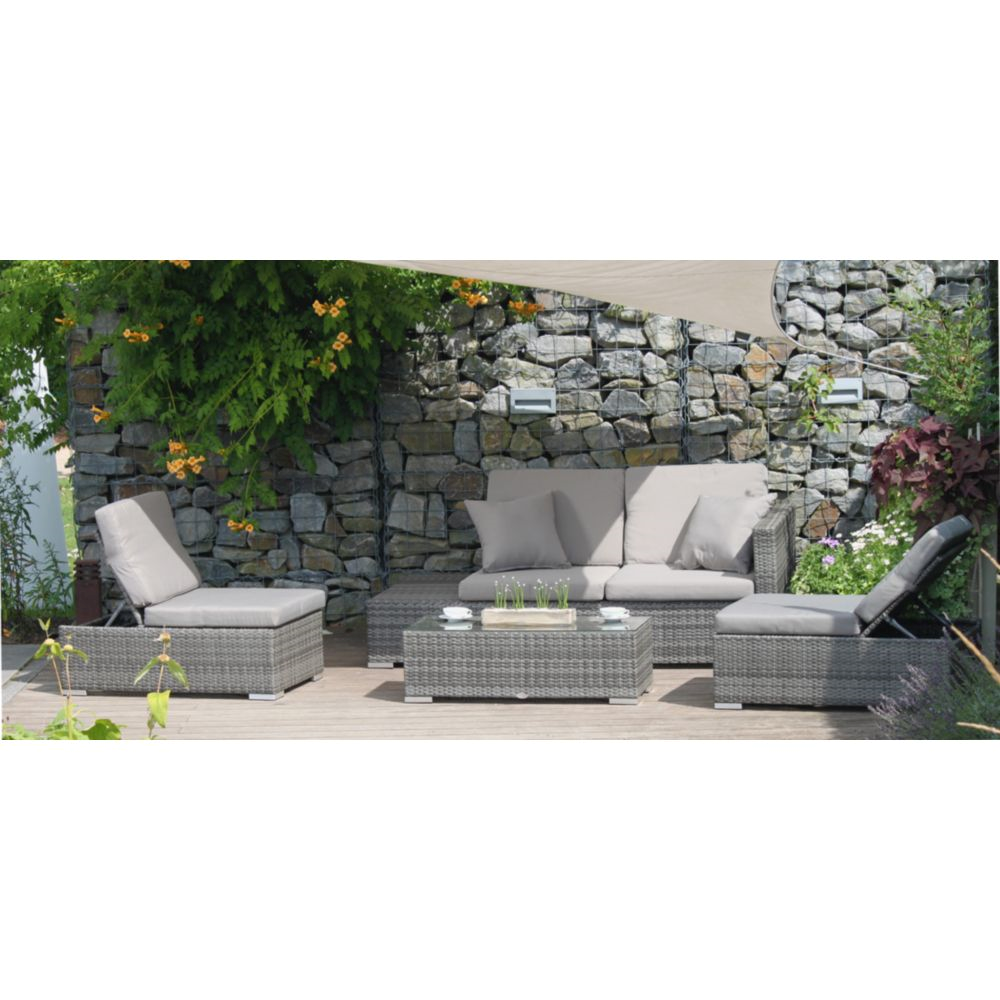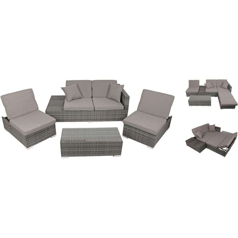 Die Möbelstücke in dieser Sitzgruppe sind aus hochwertigem, grauem Aluminium und grauem Kunststoffgeflecht gefertigt, was ihnen eine moderne Ästhetik und Wetterbeständigkeit verleiht. Sie können die Sitzgruppe ALCUDIA auch in ein gemütliches Bett umwandeln, um bequem im Freien zu schlafen oder zu entspannen.