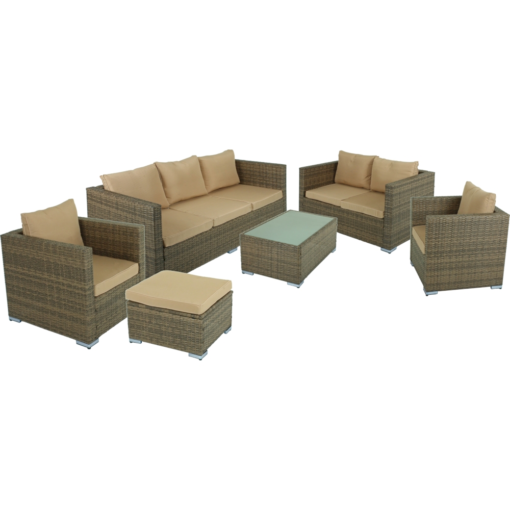 Das Set besteht aus einem eleganten Tisch mit einer klaren Glasplatte, einem 2-Sitzer Sofa, einem 3-Sitzer Sofa, zwei Sesseln und einem praktischen Fußhocker.