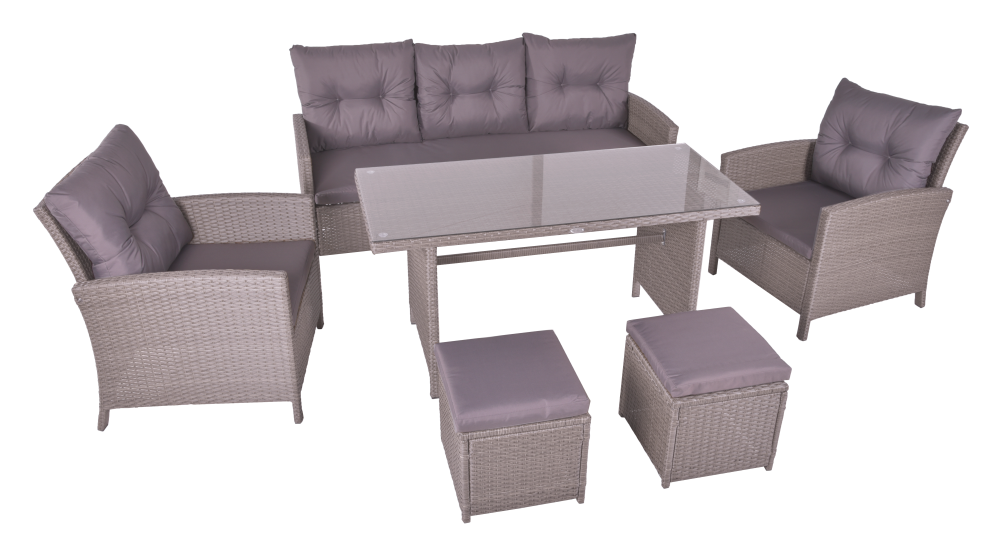 Die Sitzgruppe SEVILLIA ist eine moderne und elegante Wahl für jeden, der eine stilvolle und bequeme Sitzgelegenheit für den Garten, den Balkon oder die Terrasse sucht. Die Sitzgruppe besteht aus einem Tisch mit einer gläsernen Tischplatte, zwei Sesseln, zwei Hockern und einem 3-Sitzer Sofa - alle Elemente sind aus robustem grauen Kunststoffgeflecht und haben ein schwarzes Stahlgestell. Die Sitzflächen und Rückenlehnen der Sessel, Hocker und des Sofas sind mit bequemen und pflegeleichten Kissen aus Polyester in der Farbe Dunkelgrau ausgestattet. Die Kissen lassen sich einfach abnehmen und bei Bedarf waschen. Das Kunststoffgeflecht ist witterungsbeständig und pflegeleicht, so dass die Sitzgruppe einfach zu reinigen und jahrelang haltbar ist. Mit ihrer großzügigen Sitzfläche bietet die Sitzgruppe SEVILLIA Platz für mehrere Personen und ist somit perfekt für Gartenpartys oder entspannte Abende im Freien. Die Montage der Sitzgruppe ist einfach und unkompliziert und erfordert keine besonderen Werkzeuge oder Kenntnisse. Mit ihrem geringen Gewicht und den kompakten Abmessungen ist die Sitzgruppe auch leicht zu bewegen und zu verstauen.