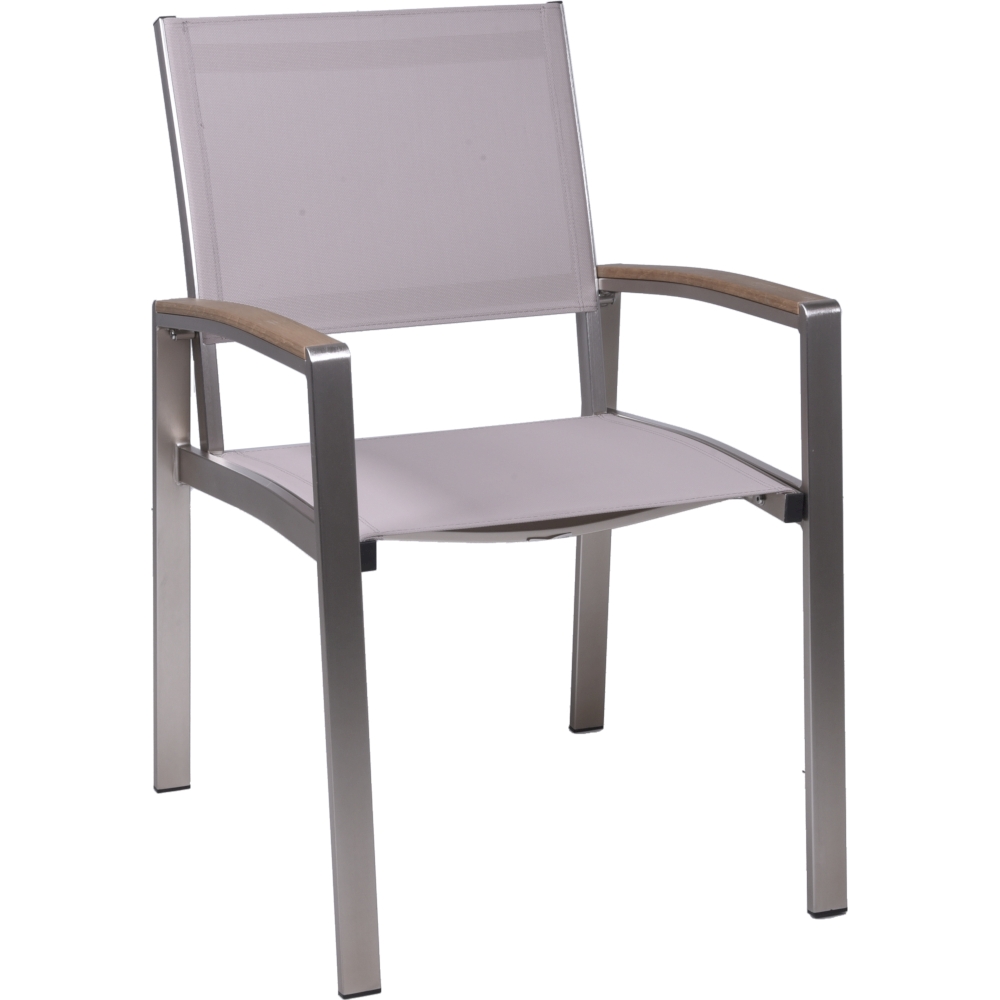Hergestellt aus hochwertigem gebürstetem grauem Aluminium und ausgestattet mit champagnerfarbenem Kunststoffgewebe, bietet dieser Stuhl eine langlebige Konstruktion, die den Elementen standhält.