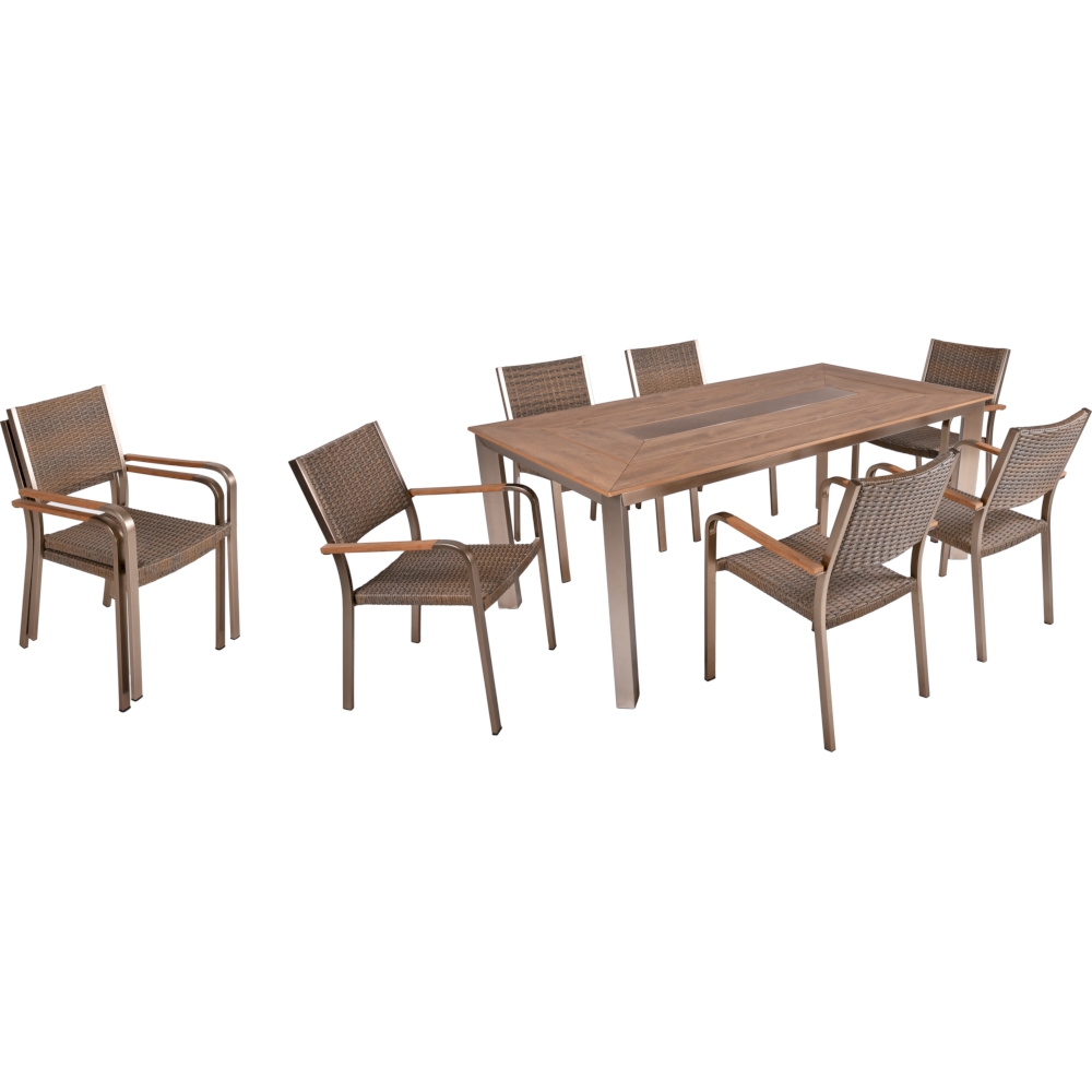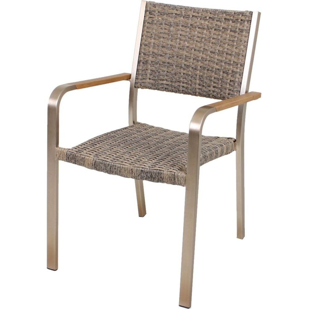 Mit einem braunen Alugestell, einem braunen Kunststoffgeflecht für Sitz- und Rückenfläche sowie braunen Armlehnen aus Nonwood Polystyrol verleiht er jedem Raum eine warme und stilvolle Atmosphäre.