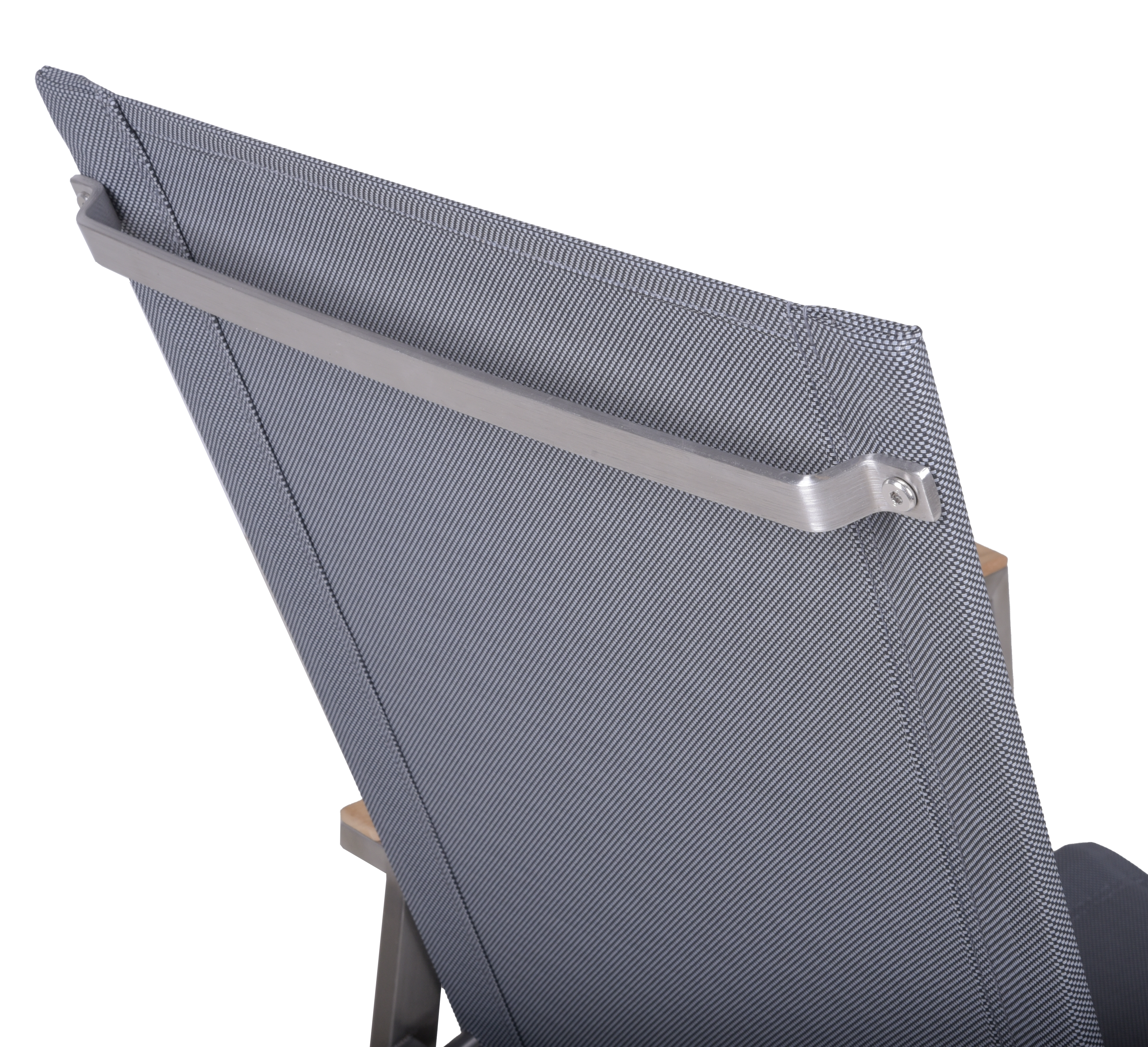Hergestellt aus robustem Stahl mit einer ansprechenden Kombination aus Teakholz und hellgrauem Kunststoffgewebe, bietet er sowohl Stabilität als auch modernes Design.