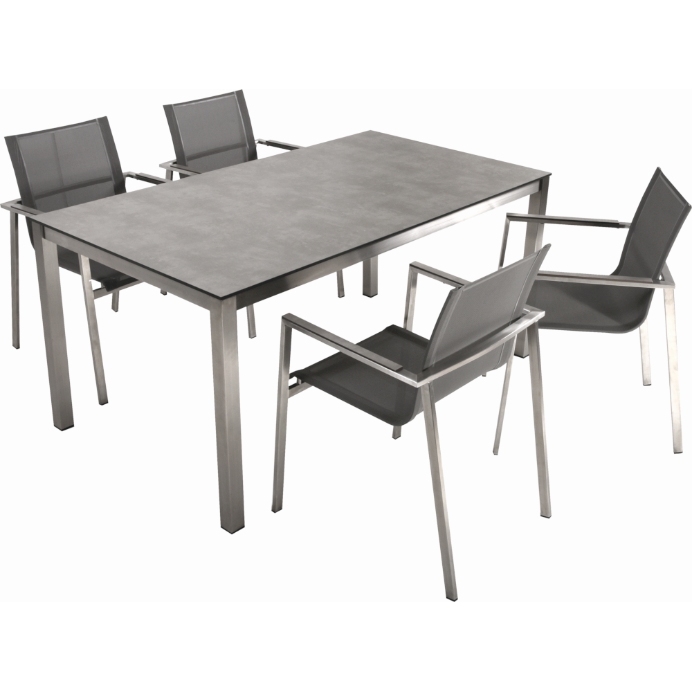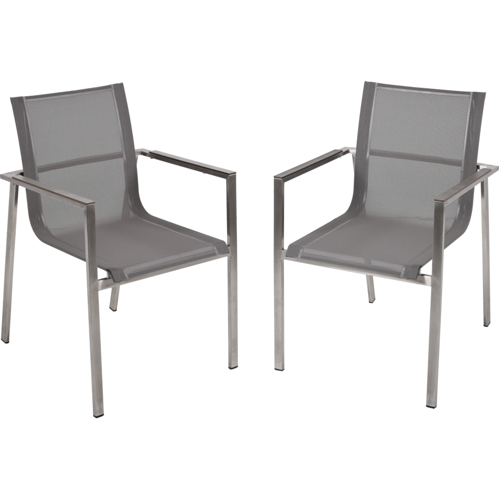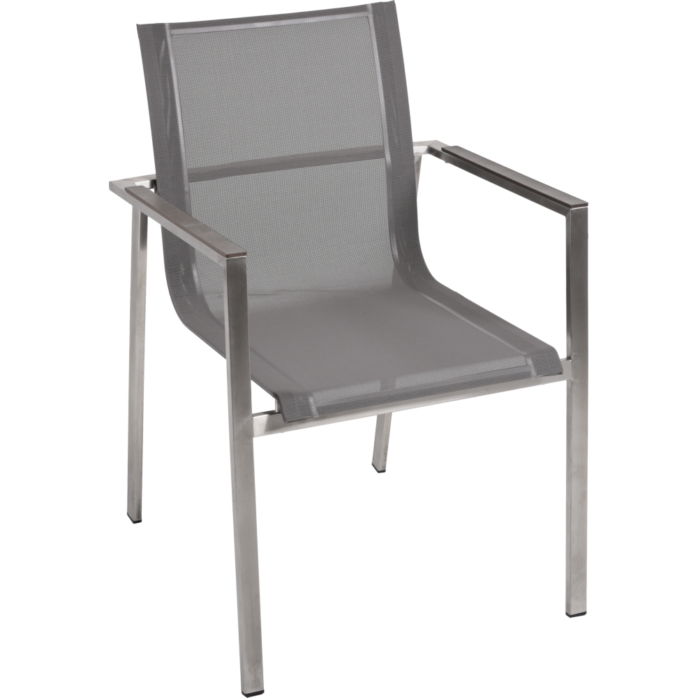 Hergestellt aus hochwertigem gebürstetem Edelstahl #304 und mit einem strapazierfähigen Kunststoffgewebe in taupe-grau ausgestattet, bietet dieser Stuhl eine langlebige Konstruktion, die den Elementen standhält.
