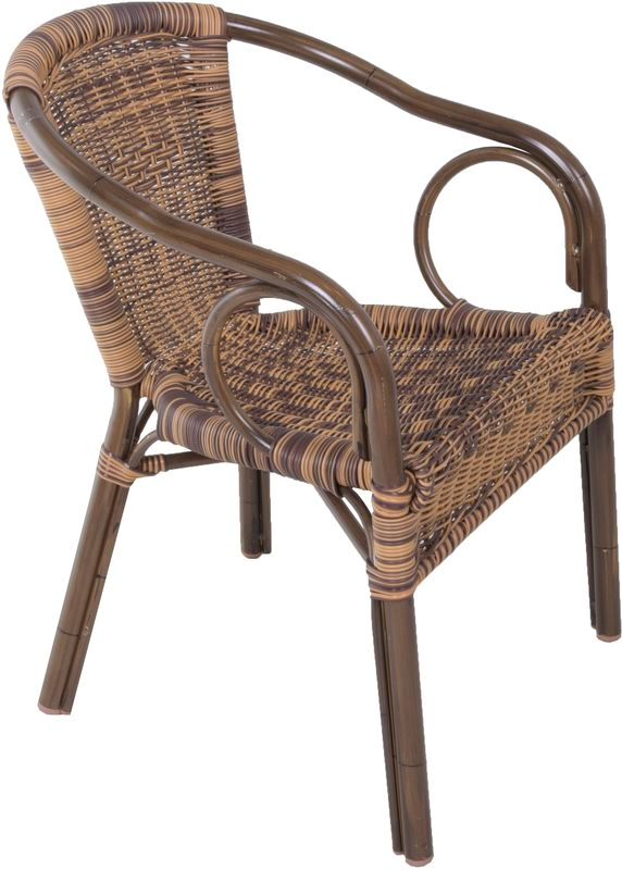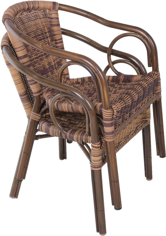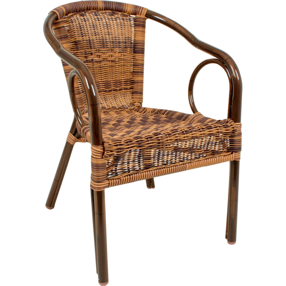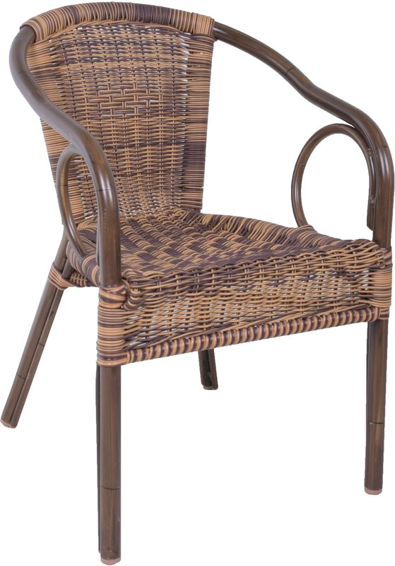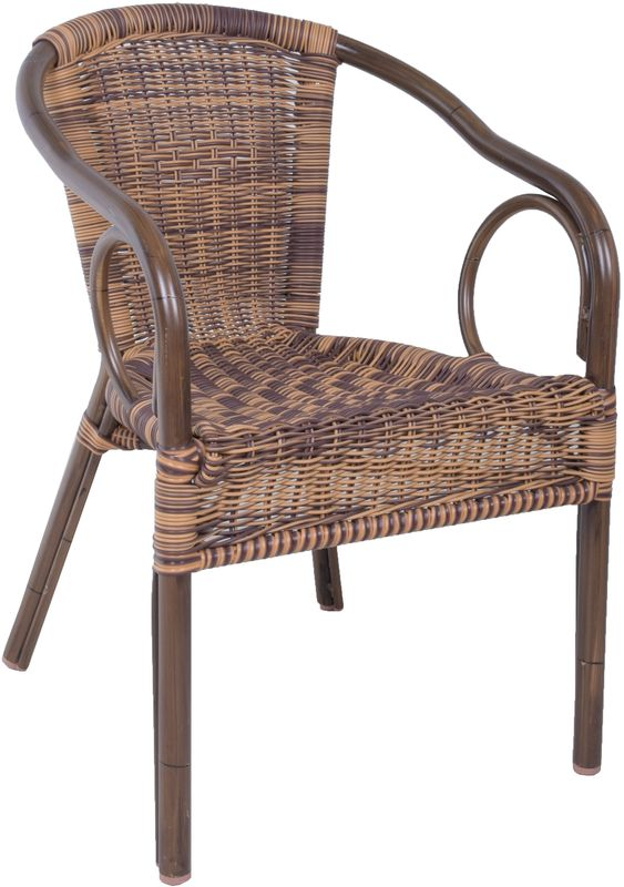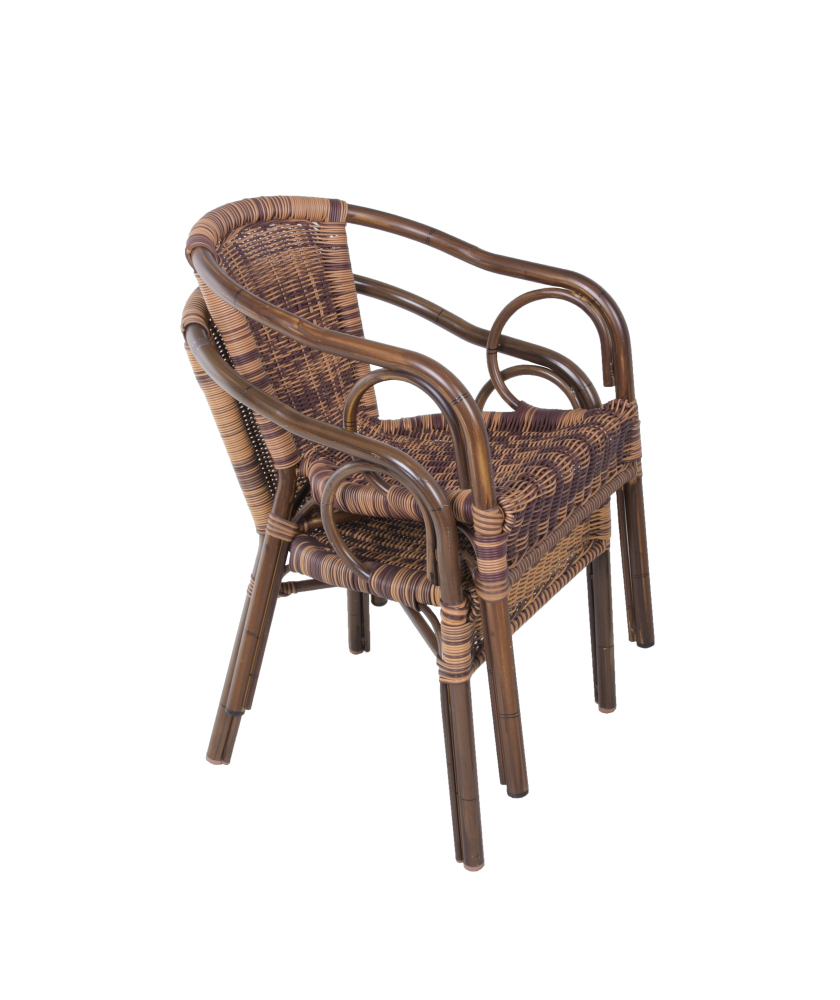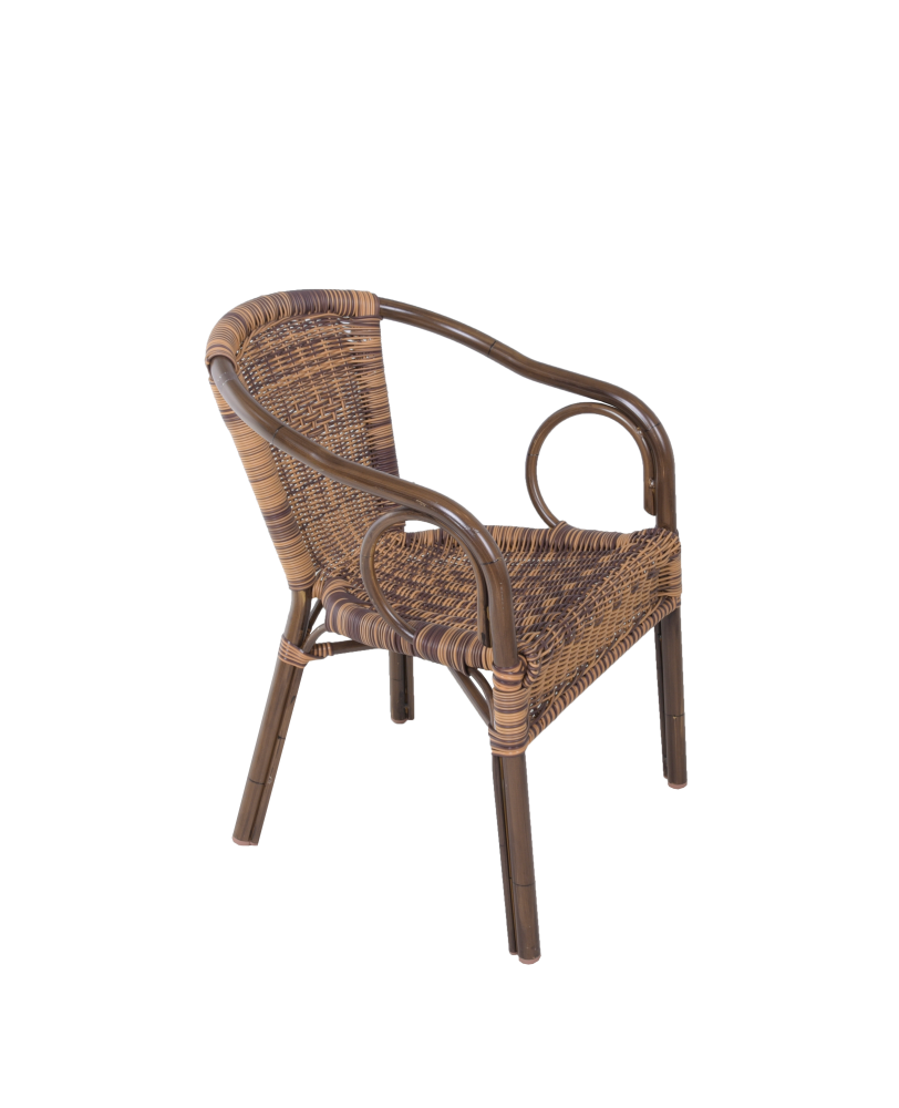 Das braun-honigfarbene Kunststoffgeflecht verleiht dem Stuhl eine natürliche Note und fügt sich harmonisch in verschiedene Umgebungen ein.