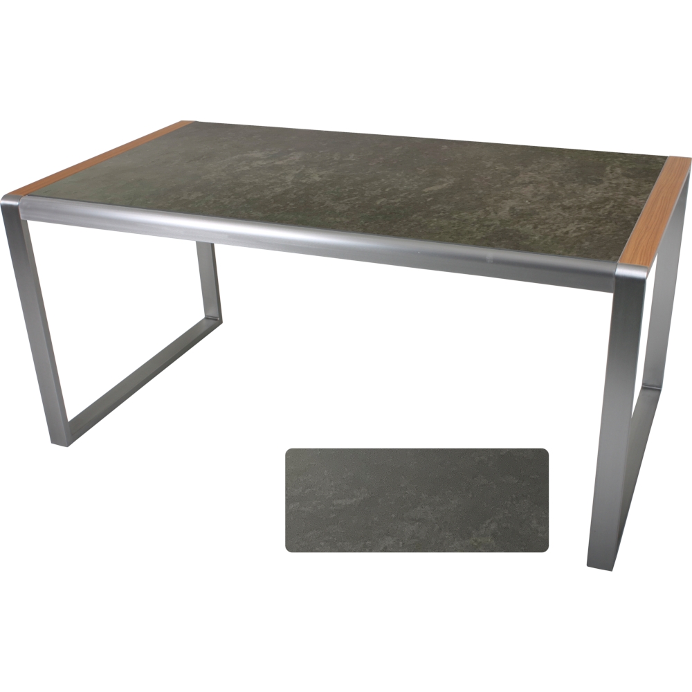 Der Tisch AVERNA verfügt über ein Gestell aus Aluminium in Grau mit Edelstahlfinish, was nicht nur für Stabilität, sondern auch für eine elegante Optik sorgt. Die Tischplatte ist aus Glas in Granitoptik gefertigt und verleiht dem Tisch ein luxuriöses und edles Aussehen. Das Nonwood-Teakoptik-Detail an der Tischplatte bietet einen Hauch von Natürlichkeit und verleiht dem Tisch eine warme Note.