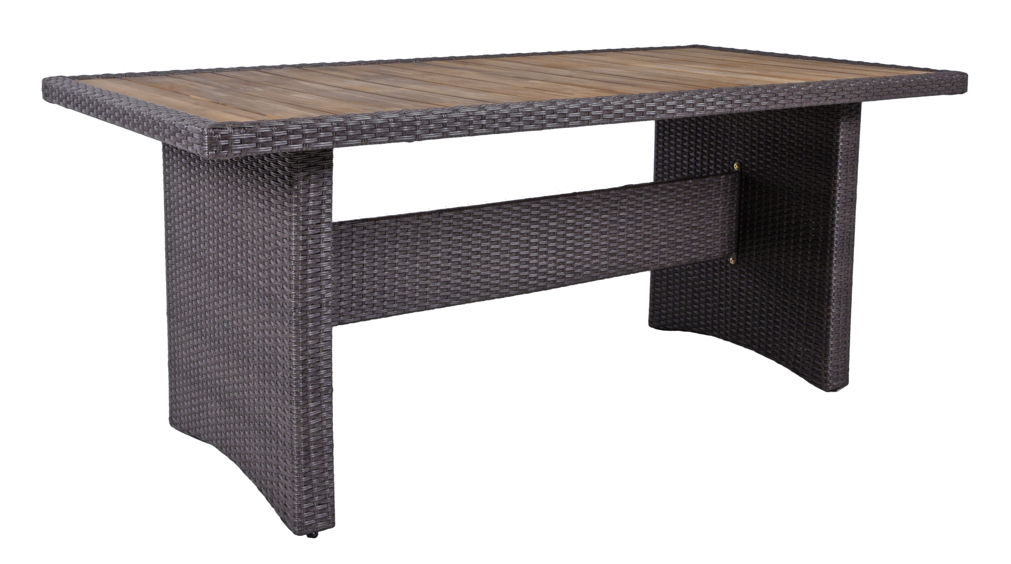 Der Tisch BRAGA ist ein stilvolles Möbelstück, das aus einer Kombination aus hochwertigem Alu- und Kunststoffgeflecht sowie einer Akazin-Tischplatte besteht.