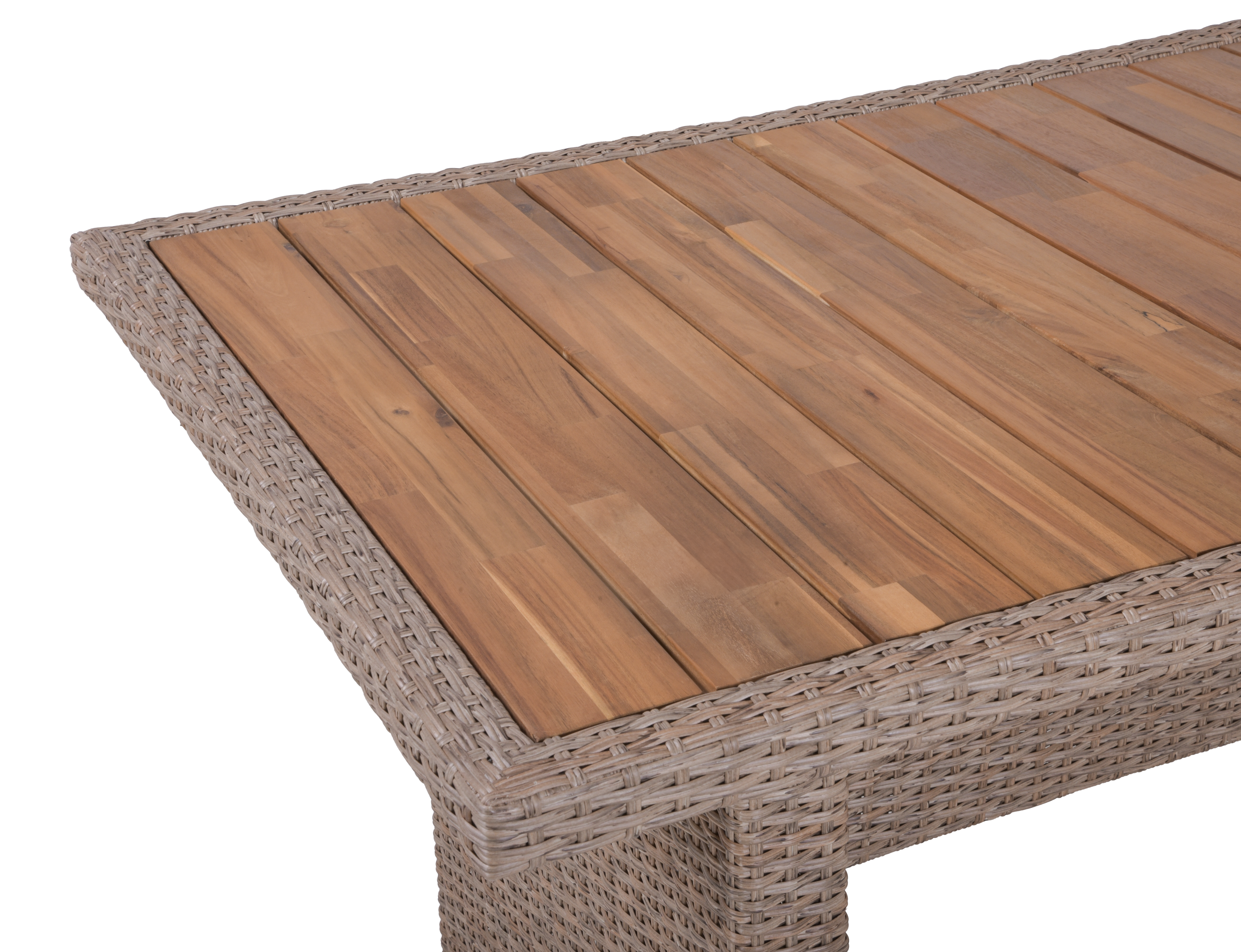 Der Tisch BRAGA ist ein stilvolles Möbelstück, das aus einer Kombination aus hochwertigem Alu- und Kunststoffgeflecht sowie einer Akazin-Tischplatte besteht.