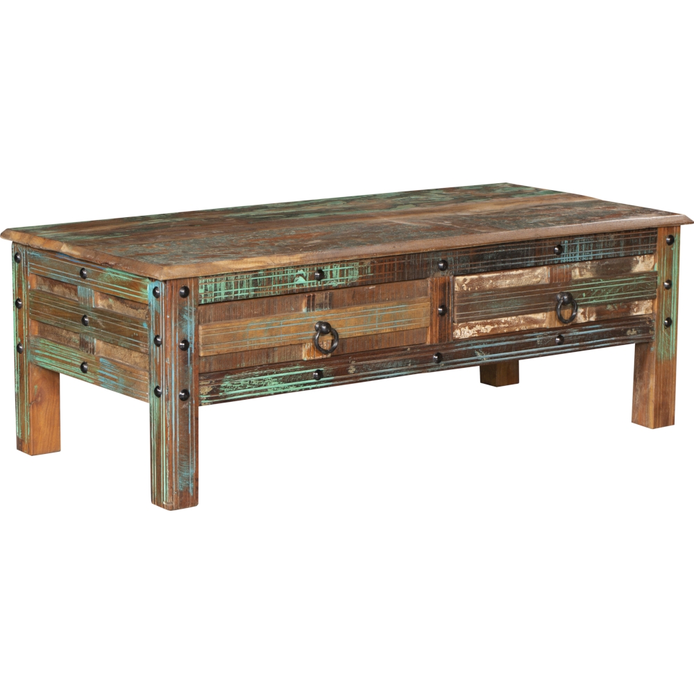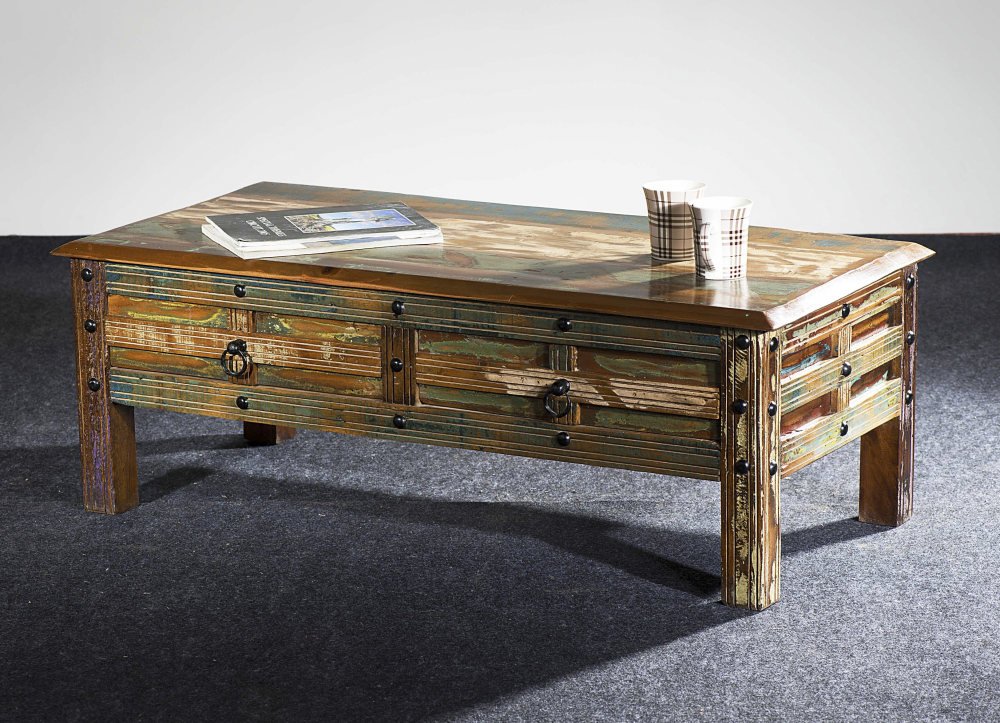Der Couchtisch KALANKA aus Massivholz (Akazie & Mango, Oberfläche lackiert) beeindruckt durch sein individuelles Design(im Used-Look).