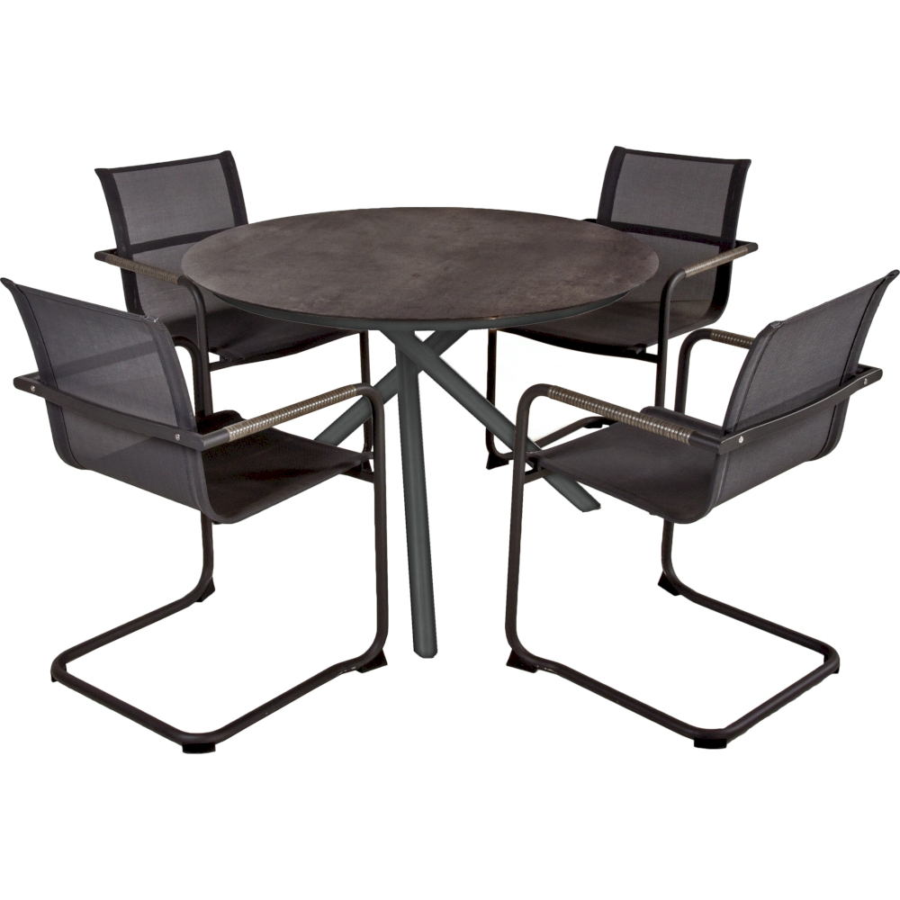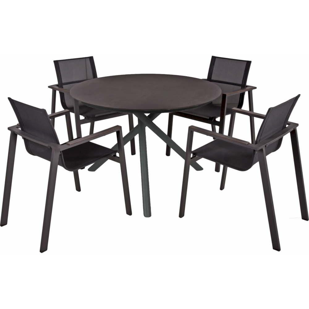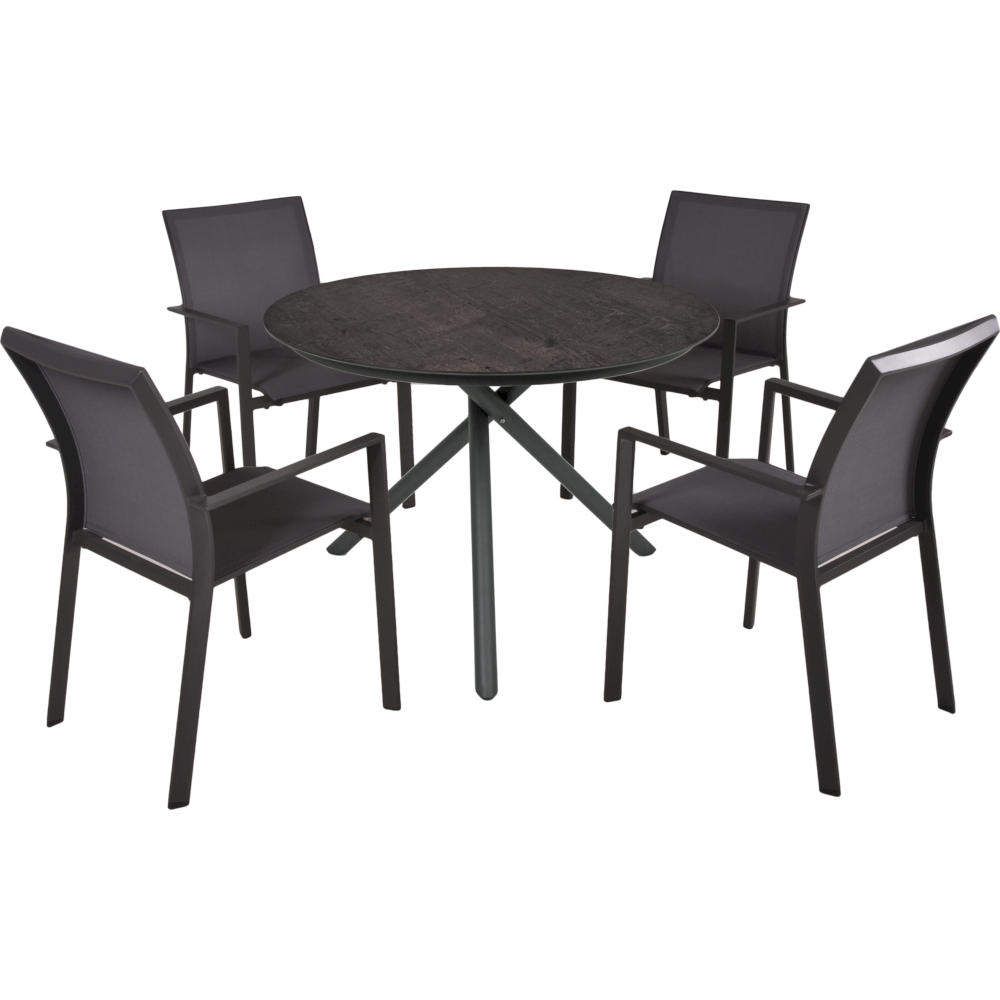 Hergestellt aus pulverbeschichtetem Aluminium in der Farbe pfefferschwarz (Industrial) und ausgestattet mit einer strapazierfähigen Kunststoff HPL-Tischplatte, bietet er eine robuste Konstruktion, die den Elementen standhält.