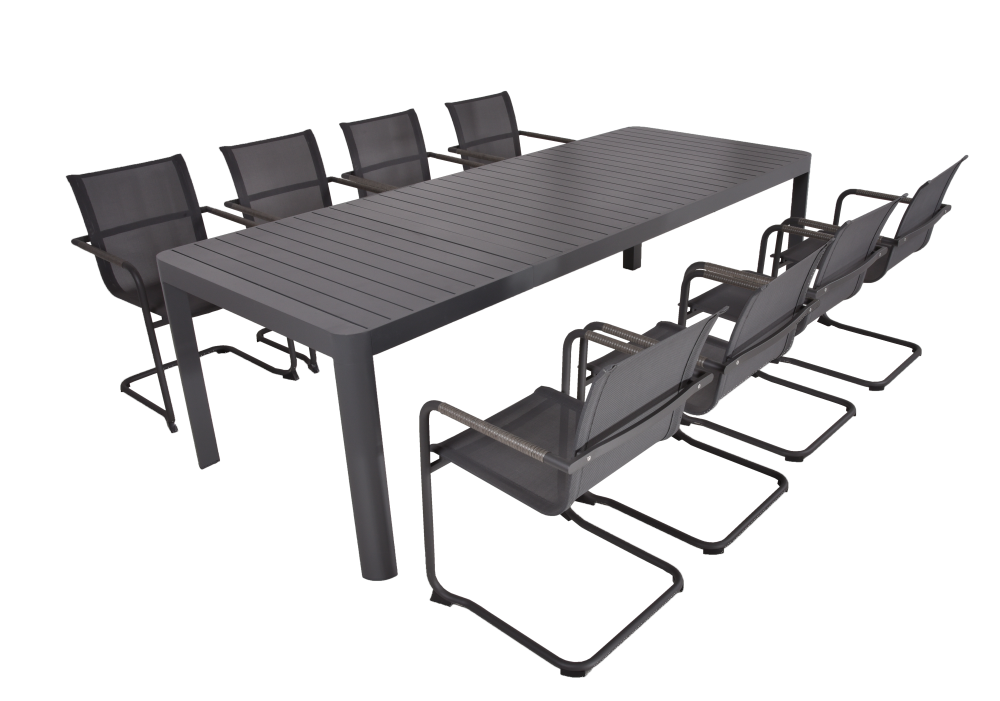 Die acht Freischwinger KENDRA-Stühle sind aus grauem Edelstahl mit einer pulverbeschichteten Oberfläche gefertigt, was für Stabilität und Langlebigkeit sorgt. Die Sitz- und Rückenflächen sind mit grauem Kunststoffgewebe bezogen, das sowohl bequem als auch wetterbeständig ist. Die Freischwinger-Designs der Stühle bieten eine angenehme Federung beim Sitzen.