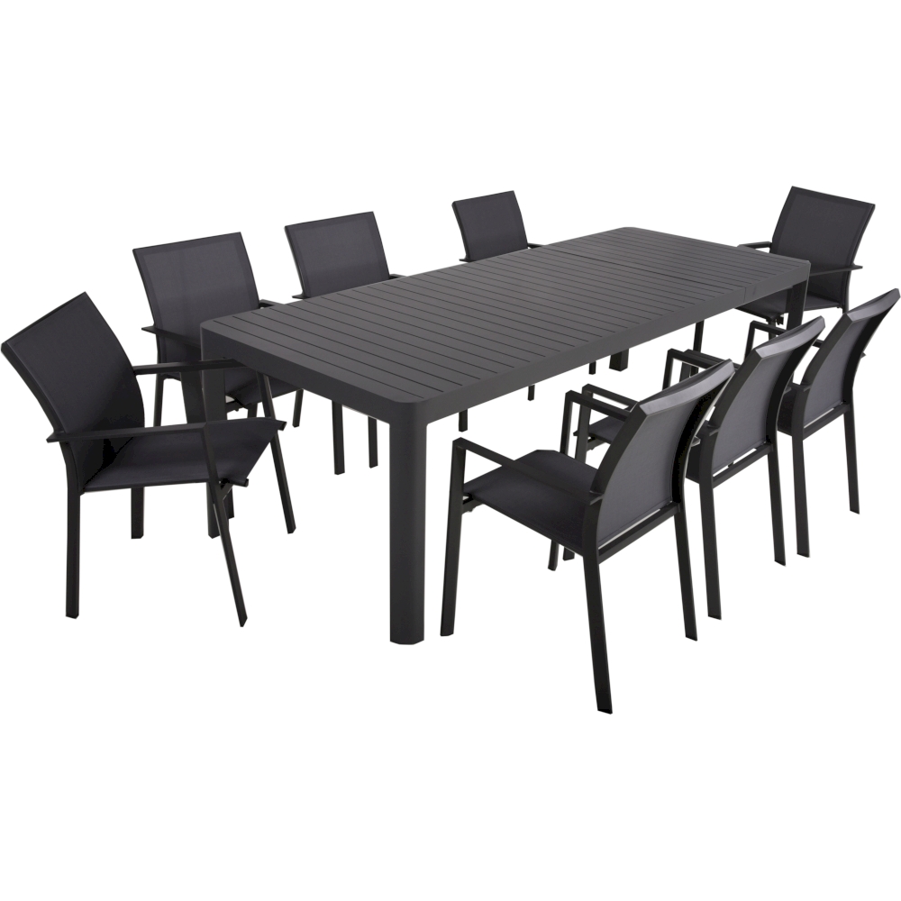Die Tischgruppe AMIRA ist eine moderne und vielseitige Lösung, um Ihren Innen- oder Außenbereich stilvoll und komfortabel zu gestalten. Dieses Set besteht aus einem Ausziehtisch AMIRA aus pulverbeschichtetem Anthrazit-Aluminium und acht Stapelstühlen RANA.