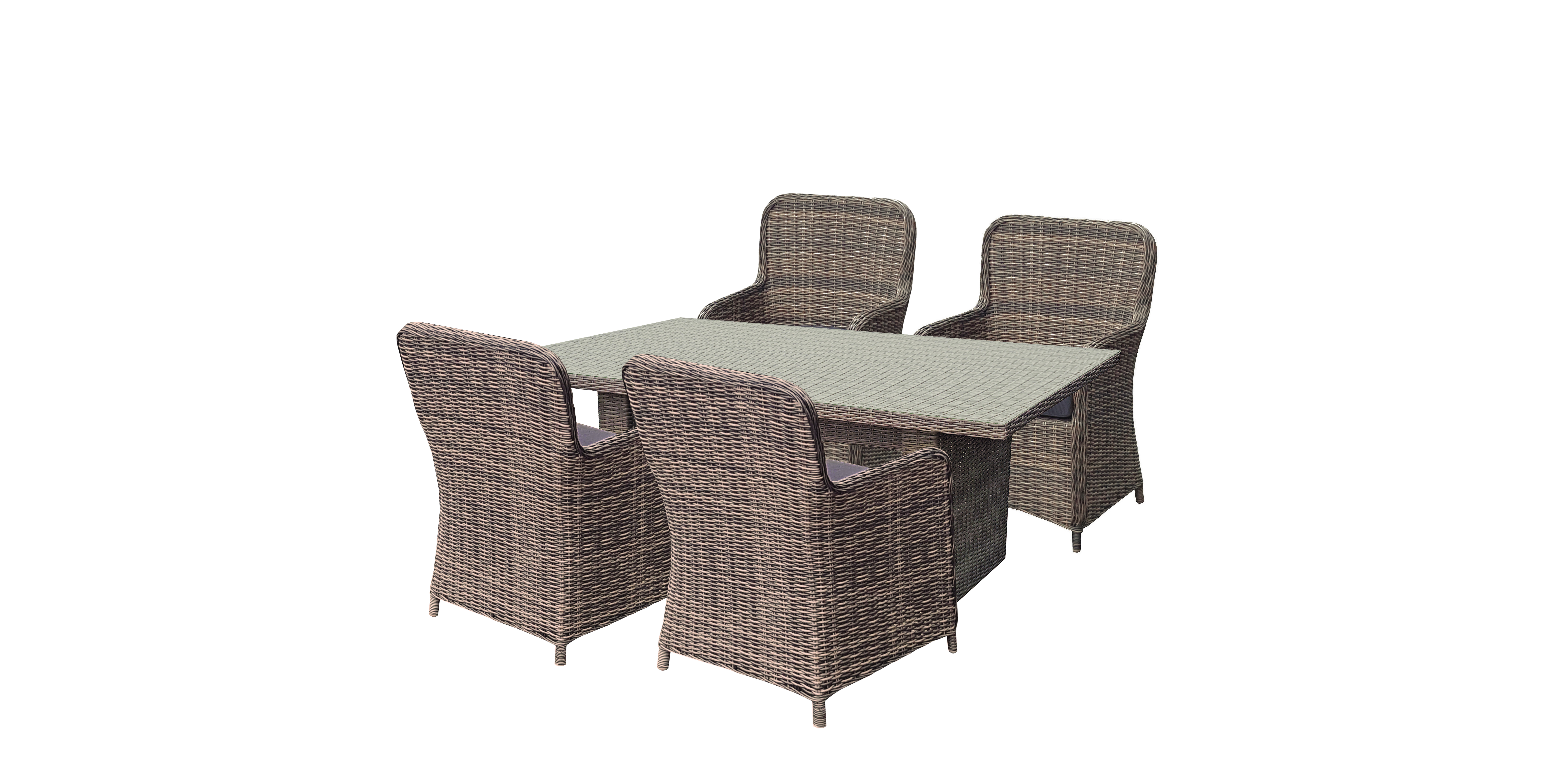 Die vier Sessel BORDEAUX sind aus pulverbeschichtetem Stahl gefertigt und verfügen über ein kunstvoll gestaltetes nelkenbraunes Kunststoffgeflecht in halbrundem und rundem Design. Die Sessel sind mit Auflagen ausgestattet, die für zusätzlichen Sitzkomfort sorgen. Diese Tischgruppe eignet sich ideal für gesellige Zusammenkünfte im Freien und schafft eine einladende Atmosphäre. Die Tischgruppe BORDEAUX vereint Qualität, Komfort und Ästhetik und ist eine perfekte Wahl für Ihre Terrasse, Ihren Garten oder Ihren Balkon. Genießen Sie stilvolle Momente im Freien mit diesem hochwertigen Möbelensemble.