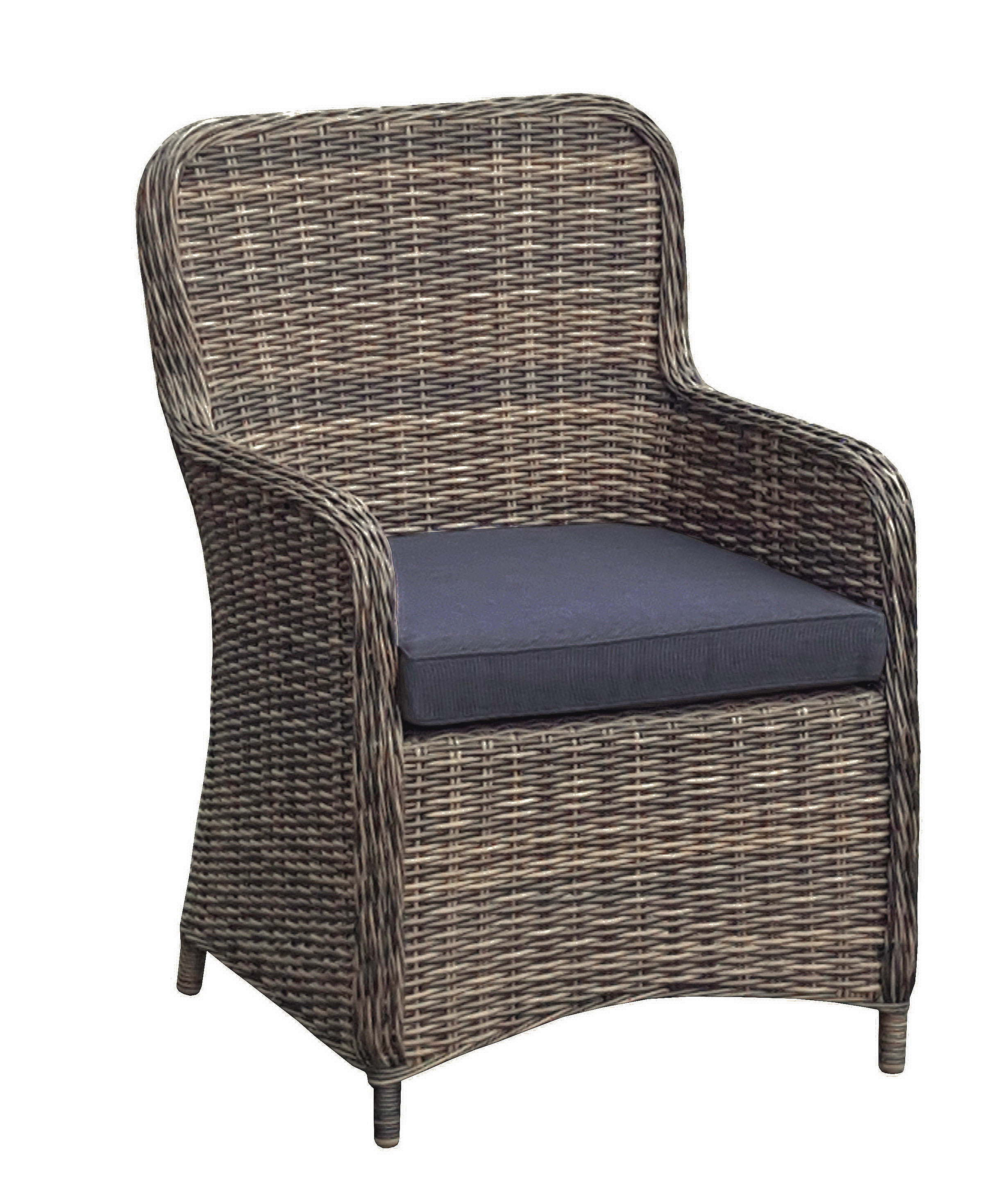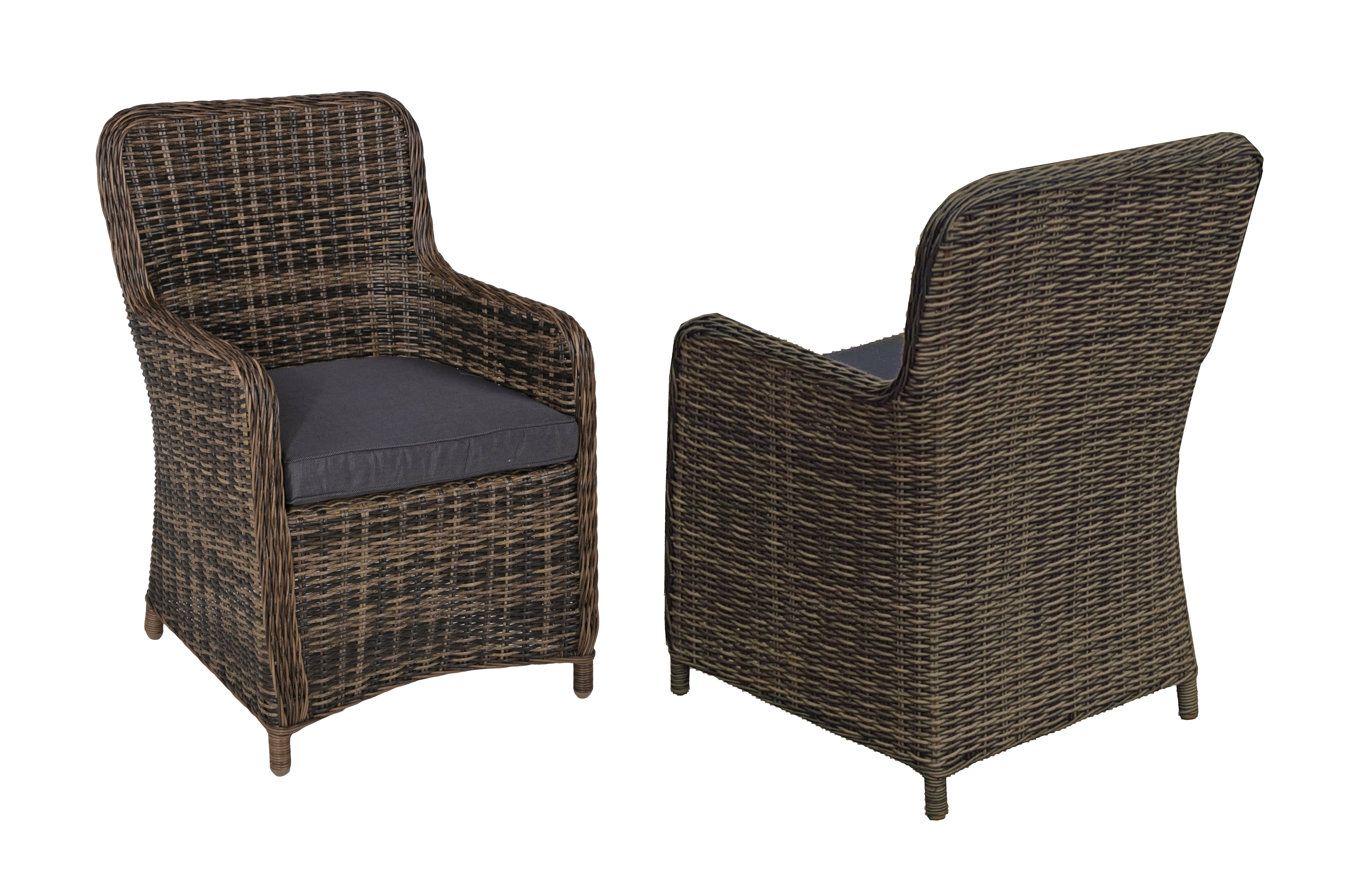 Die sechs Sessel BORDEAUX sind aus pulverbeschichtetem Stahl gefertigt und verfügen über ein kunstvoll gestaltetes nelkenbraunes Kunststoffgeflecht in halbrundem und rundem Design. Die Sessel sind mit Auflagen ausgestattet, die für zusätzlichen Sitzkomfort sorgen.