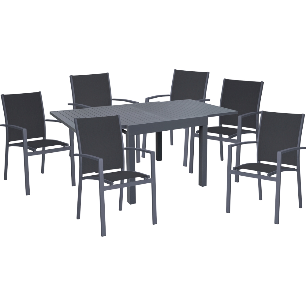 Die sechs Stühle ELENA sind ebenfalls aus Aluminium gefertigt und bieten ein robustes Design, das den Test der Zeit überstehen wird. Die Stühle verfügen über eine bequeme Sitzfläche und Rückenlehne aus Kunststoffgewebe in der Farbe Dunkelgrau. Das Material ist strapazierfähig und pflegeleicht, so dass Sie es einfach sauber halten können. Die Stühle sind stapelbar und können bei Nichtgebrauch platzsparend aufbewahrt werden.