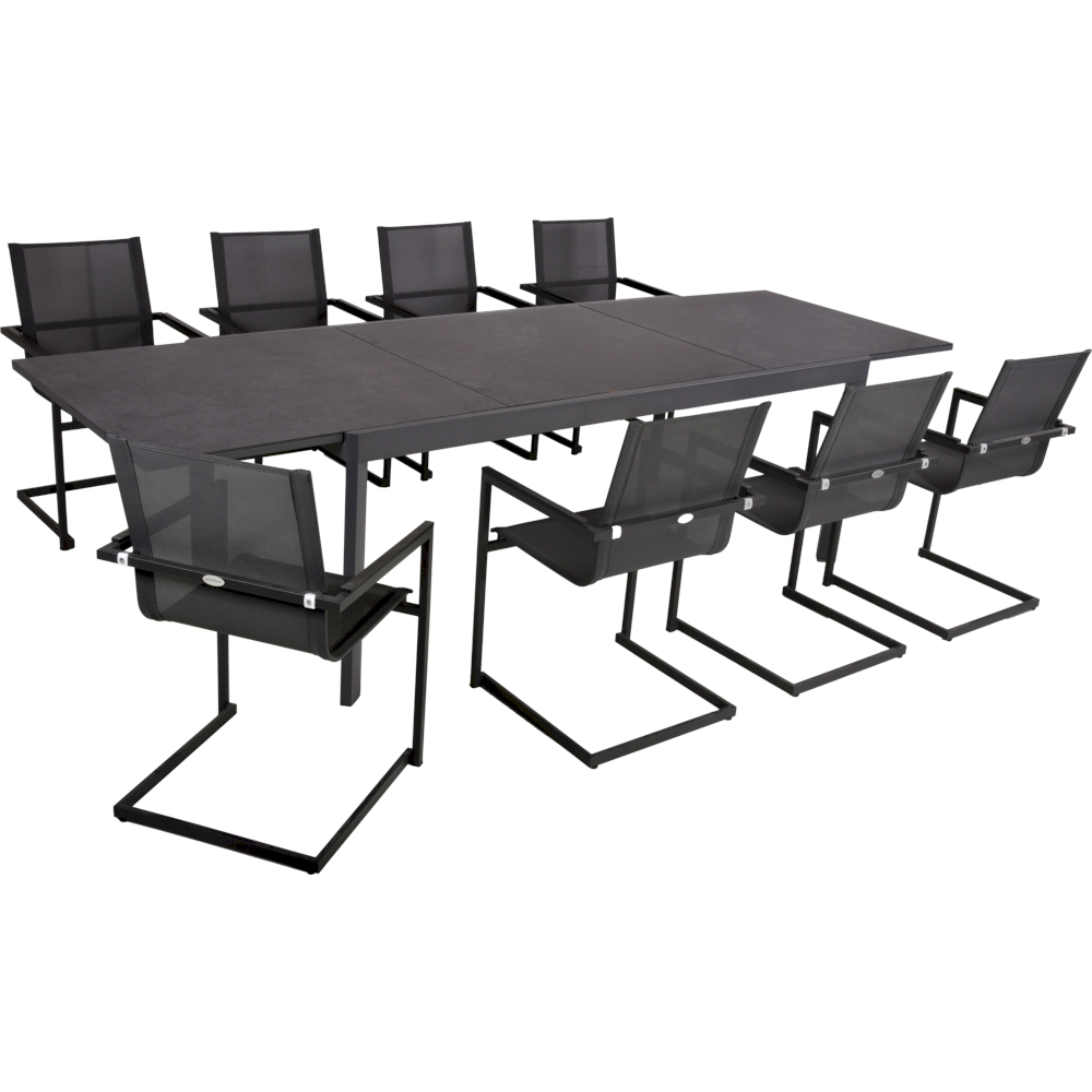 Die Tischgruppe NEREA ist eine elegante und vielseitige Lösung, um Ihren Innen- oder Außenbereich stilvoll und komfortabel zu gestalten. Dieses Set besteht aus einem Ausziehtisch NEREA, der sich von 2 Metern auf beeindruckende 3 Meter verlängern lässt, und acht Freischwinger SOPHIA-Stühlen, die sorgfältig gestaltet wurden, um sowohl Ästhetik als auch Funktionalität zu bieten.