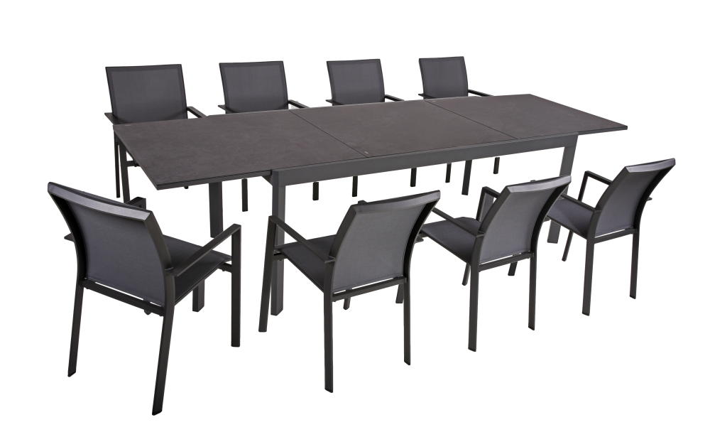 Der Ausziehtisch NEREA verfügt über ein robustes Gestell aus pulverbeschichtetem Anthrazit-Aluminium, was nicht nur für Stabilität, sondern auch für Wetterbeständigkeit sorgt. Die Tischplatte besteht aus Glas in Keramik-Optik, was nicht nur langlebig ist, sondern auch eine elegante Ästhetik bietet. Der Ausziehmechanismus des Tisches, der sich unterhalb der Tischplatte befindet, ermöglicht es Ihnen, die Tischgröße je nach Bedarf anzupassen, um mehr Gäste zu empfangen oder zusätzlichen Raum freizugeben.