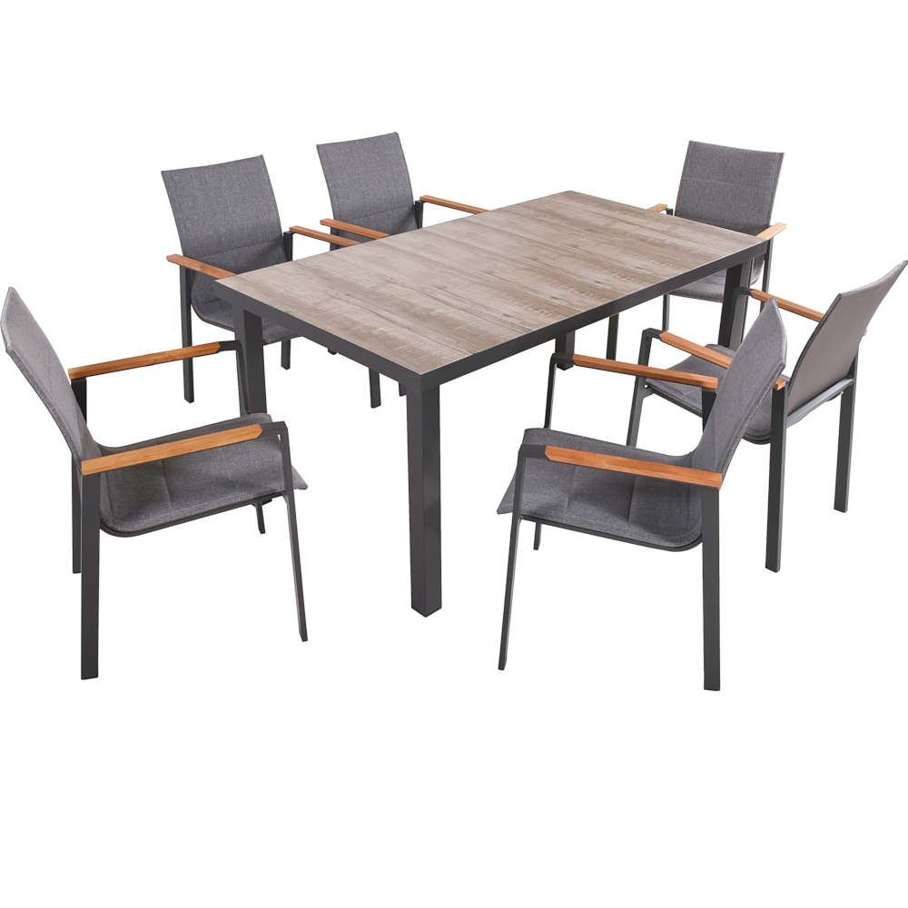Die sechs Stapelstühle DAVINA sind aus pulverbeschichtetem Anthrazit-Aluminium gefertigt und verfügen über Sitzflächen aus dunkelgrauem Polyester. Die besondere Attraktion dieser Stühle sind die Armlehnen aus FSC 100% Teakholz, die nicht nur eine warme Note hinzufügen, sondern auch eine komfortable Sitzposition bieten. Die Stapelfunktion der Stühle erleichtert die Lagerung und Handhabung, insbesondere wenn sie nicht in Gebrauch sind.
