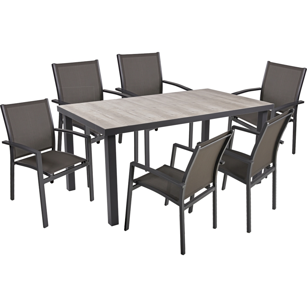 Die Tischgruppe RANA ist eine moderne und stilvolle Lösung, um Ihren Innen- oder Außenbereich komfortabel und ansprechend zu gestalten. Dieses Set besteht aus einem Tisch RANA mit einer Keramik-Tischplatte in Eiche-Optik, die auf einem Gestell aus pulverbeschichtetem Aluminium in dunkelgrau ruht, sowie sechs Stapelstühlen ELENA aus Aluminium mit Sitzflächen aus dunkelgrauem Kunststoffgewebe.