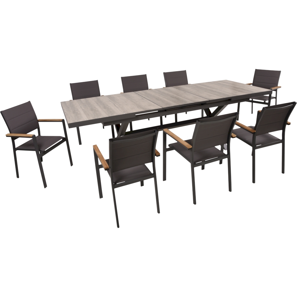 Die acht Stapelstühle ELENA sind mit einem anthrazitfarbenen Aluminiumrahmen und einem dunkelgrauen Kunststoffgewebe bezogen. Die Stühle bieten einen hervorragenden Sitzkomfort und verfügen über Armlehnen aus Teakholz mit FSC 100% Zertifizierung, die einen eleganten Kontrast zum modernen Design der Stühle bieten. Dank ihrer Stapelfunktion können die Stühle bei Bedarf platzsparend verstaut werden. Dieses Set enthält einen Ausziehtisch und acht Stühle und ist ideal für Outdoor-Mahlzeiten und Unterhaltung mit Familie und Freunden geeignet.