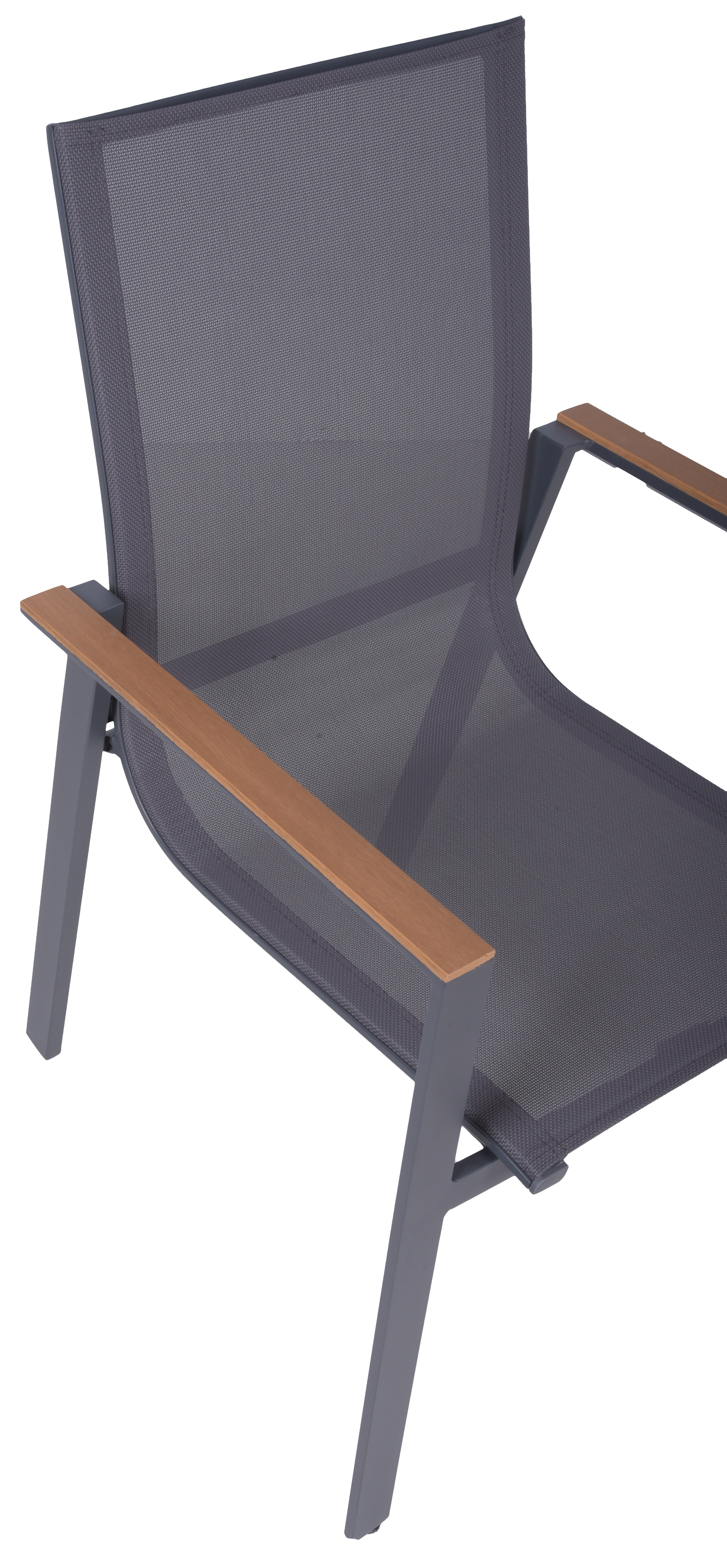 Die acht Stapelstühle SILEA sind mit einem pulverbeschichteten Anthrazit-Aluminiumrahmen ausgestattet und mit dunkelgrauem Polyester bezogen. Die Armlehnen aus natürlichem Nonwood bieten zusätzlichen Komfort und verleihen den Stühlen eine warme, natürliche Note. Die Stapelstühle ermöglichen eine einfache Aufbewahrung und sparen Platz, wenn sie nicht in Gebrauch sind. Dieses Set enthält einen Ausziehtisch und acht Stühle und ist perfekt für gesellige Abende im Freien mit Familie und Freunden geeignet.