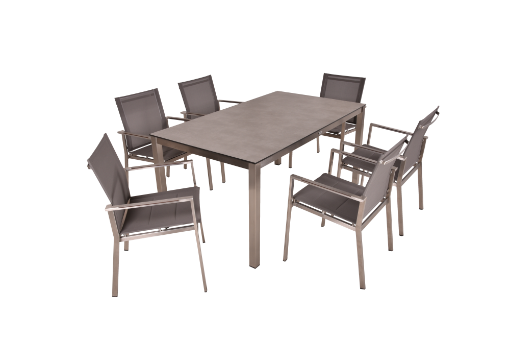 Die sechs Stapelstühle SIENNA sind ebenfalls aus gebürstetem Edelstahl #304 gefertigt und verfügen über Sitzflächen aus Kunststoffgewebe mit einem 2x2-Muster in einem taupefarbenen Ton. Die Sitzflächen sind zudem gepolstert, was den Sitzkomfort weiter erhöht.
