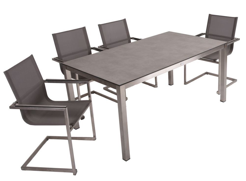 Die Möbel sind aus hochwertigem Edelstahl gefertigt und mit einer Seilbespannung in der Farbe Taupe bezogen, die nicht nur stilvoll aussieht, sondern auch wetterbeständig und pflegeleicht ist. Der Tisch hat eine robuste Tischplatte aus Kunststoff (HPL) in der Farbe Grau, die ihm Stabilität und Langlebigkeit verleiht.