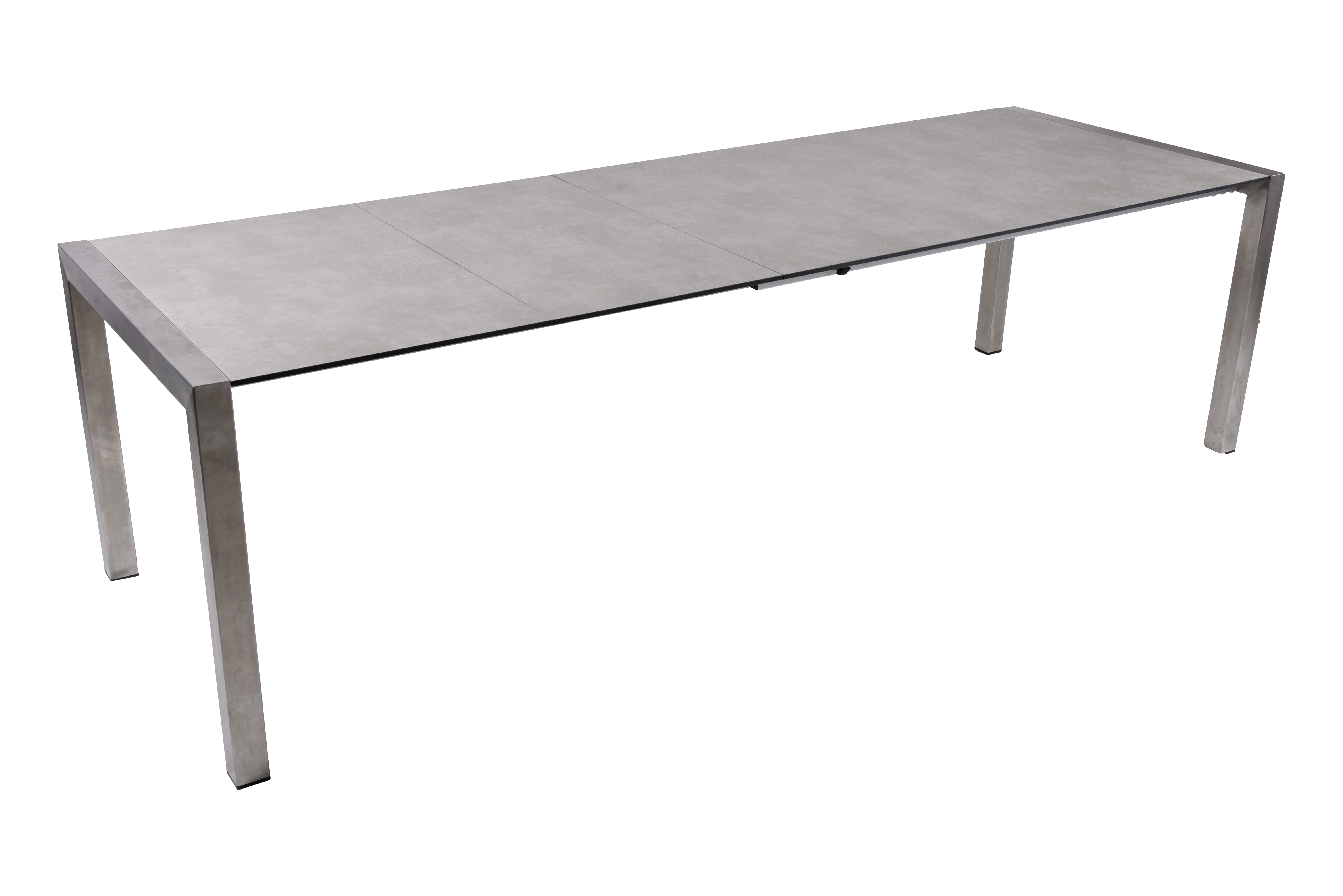 Der Ausziehtisch SIENNA ist aus hochwertigem gebürstetem Edelstahl #304 und grauem Kunststoff HPL gefertigt, was ihm eine langlebige und attraktive Optik verleiht.