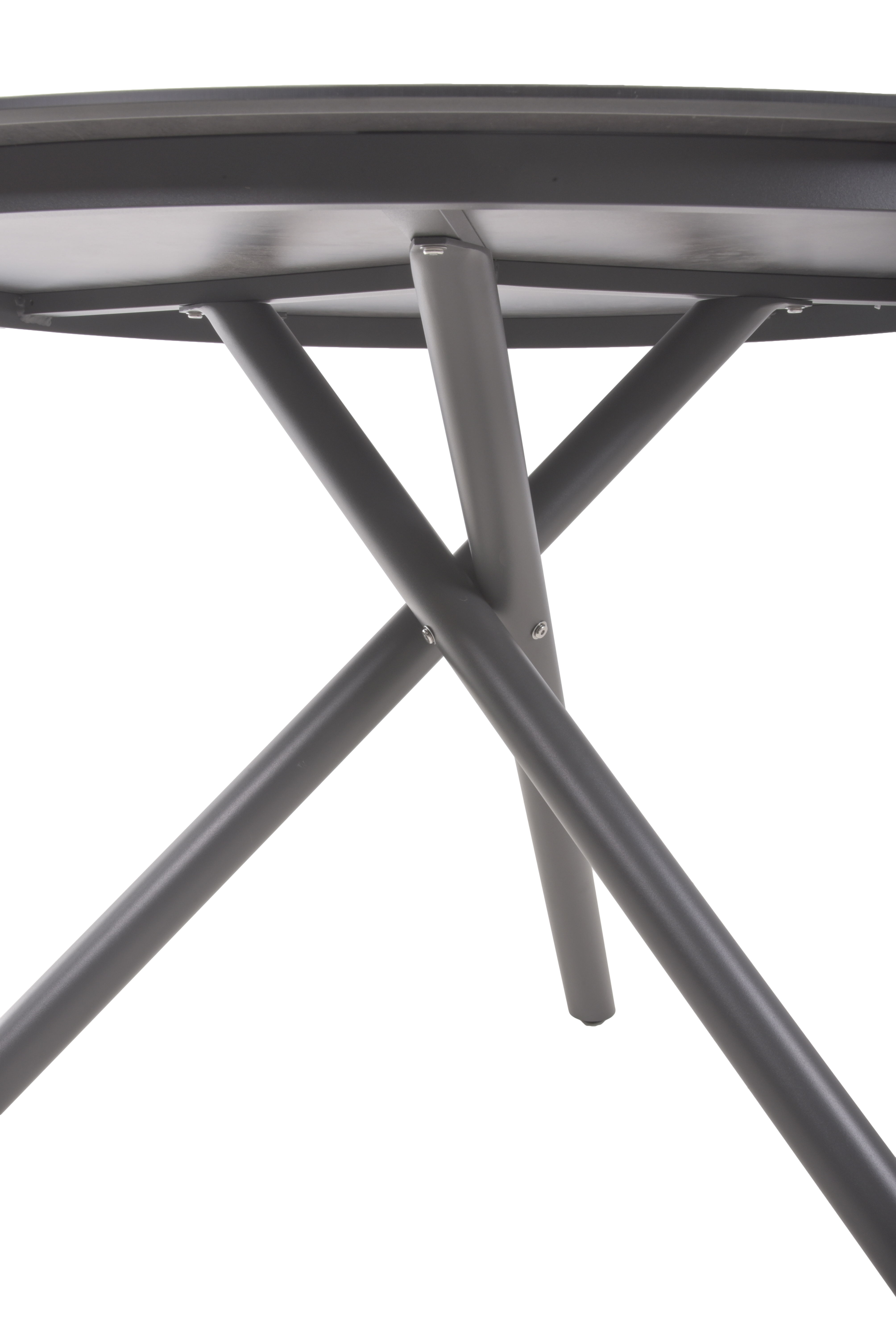Der runde Tisch SOPHIA besteht aus pulverbeschichtetem Aluminium in der eleganten Farbe pfefferschwarz (Industrial) und verfügt über eine robuste Kunststoff HPL-Tischplatte, die langlebig und pflegeleicht ist.