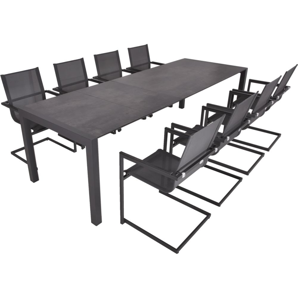 Dieses Set enthält einen Ausziehtisch und acht Freischwinger-Stühle, die perfekt aufeinander abgestimmt sind und eine moderne und bequeme Sitzlösung für Ihre Outdoor-Mahlzeiten bieten.