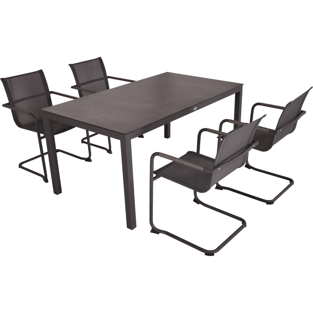 Die vier Freischwinger KENDRA-Stühle sind aus grauem Edelstahl gefertigt, was für Stabilität und Langlebigkeit sorgt. Die Sitz- und Rückenflächen sind mit grauem Kunststoffgewebe bezogen, das sowohl bequem als auch wetterbeständig ist. Die Freischwinger-Designs der Stühle bieten eine angenehme Federung beim Sitzen.