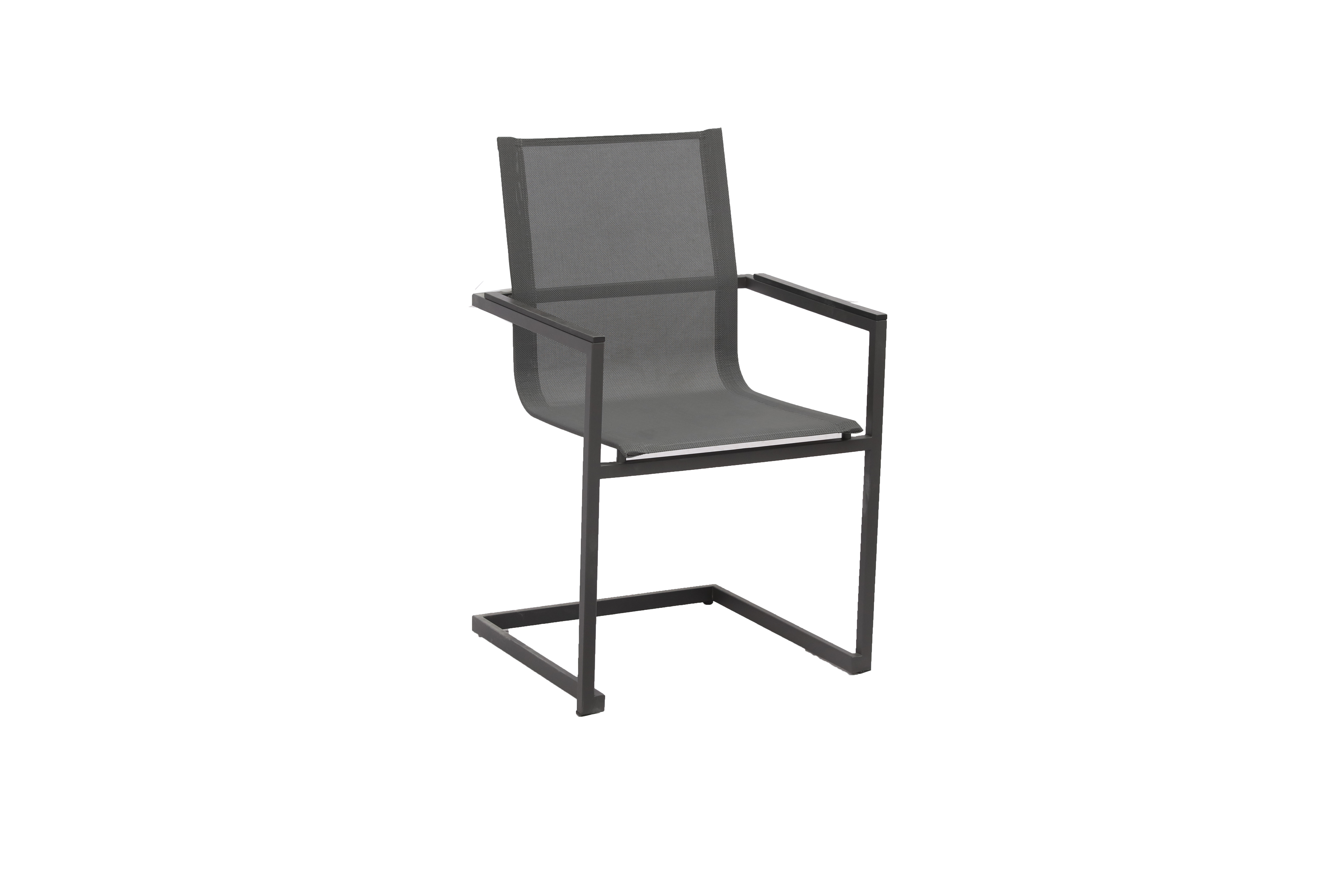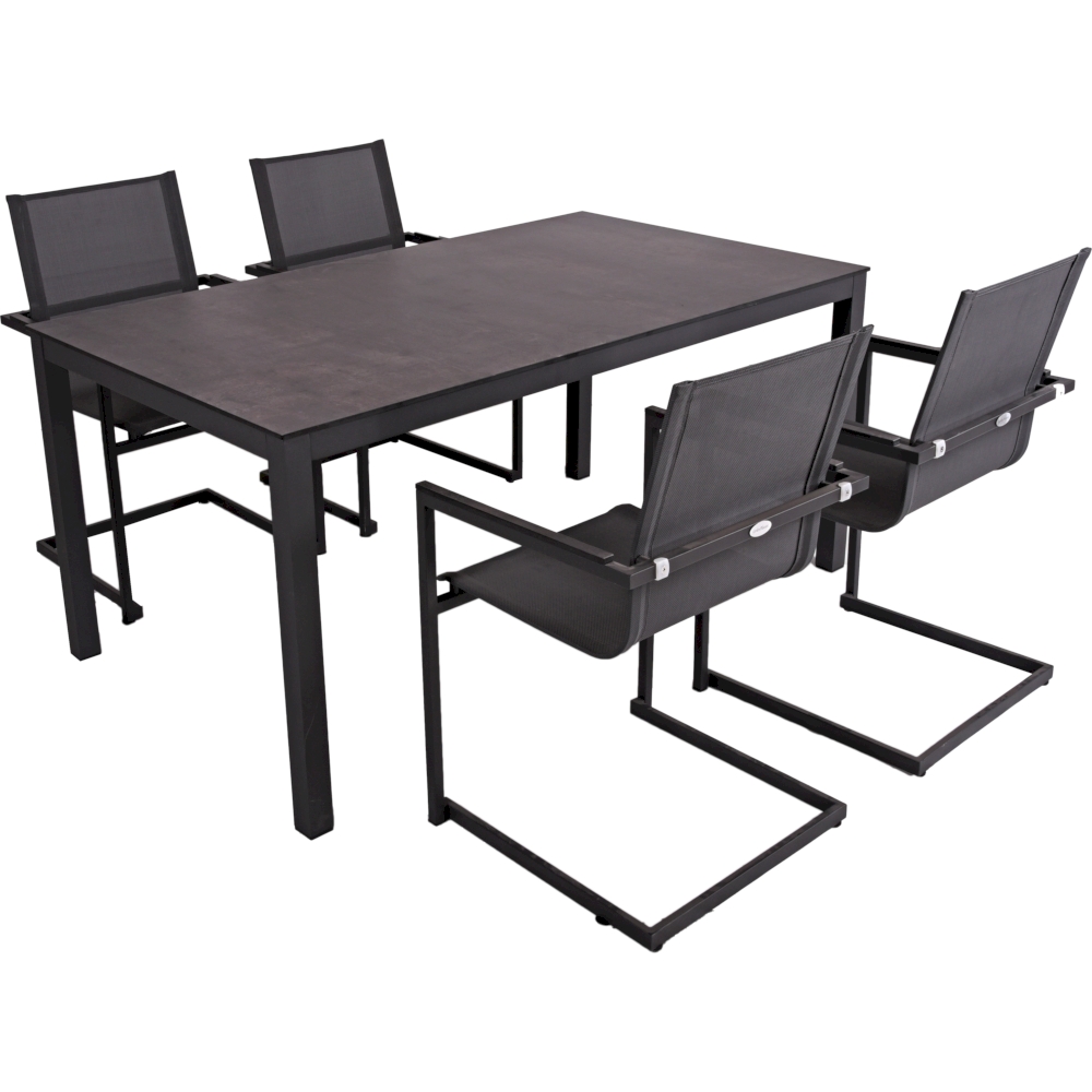Die vier Freischwinger SOPHIA-Stühle sind aus Edelstahl #304 gefertigt, was für Stabilität und Langlebigkeit sorgt. Die Sitz- und Rückenflächen sind mit grauem Kunststoffgewebe bezogen, das nicht nur bequem ist, sondern auch wetterbeständig und pflegeleicht. Das 2x2-Muster im Gewebe verleiht den Stühlen eine moderne Optik.