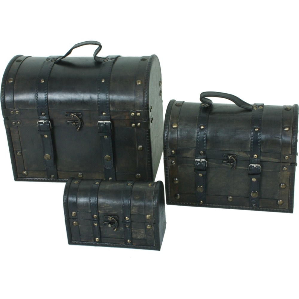 Das 3er-Set Truhen "BIEDERMEIER" präsentiert eine reizvolle Kombination von Stil und Funktionalität. Diese Truhen sind aus strapazierfähigem schwarzen Sperrholz und PVC gefertigt und bestechen durch ihre klassische Farbe und das ansprechende Design. Das Set enthält Truhen in verschiedenen Größen (groß, mittel und klein), was vielseitige Aufbewahrungsmöglichkeiten für Gegenstände aller Art bietet.