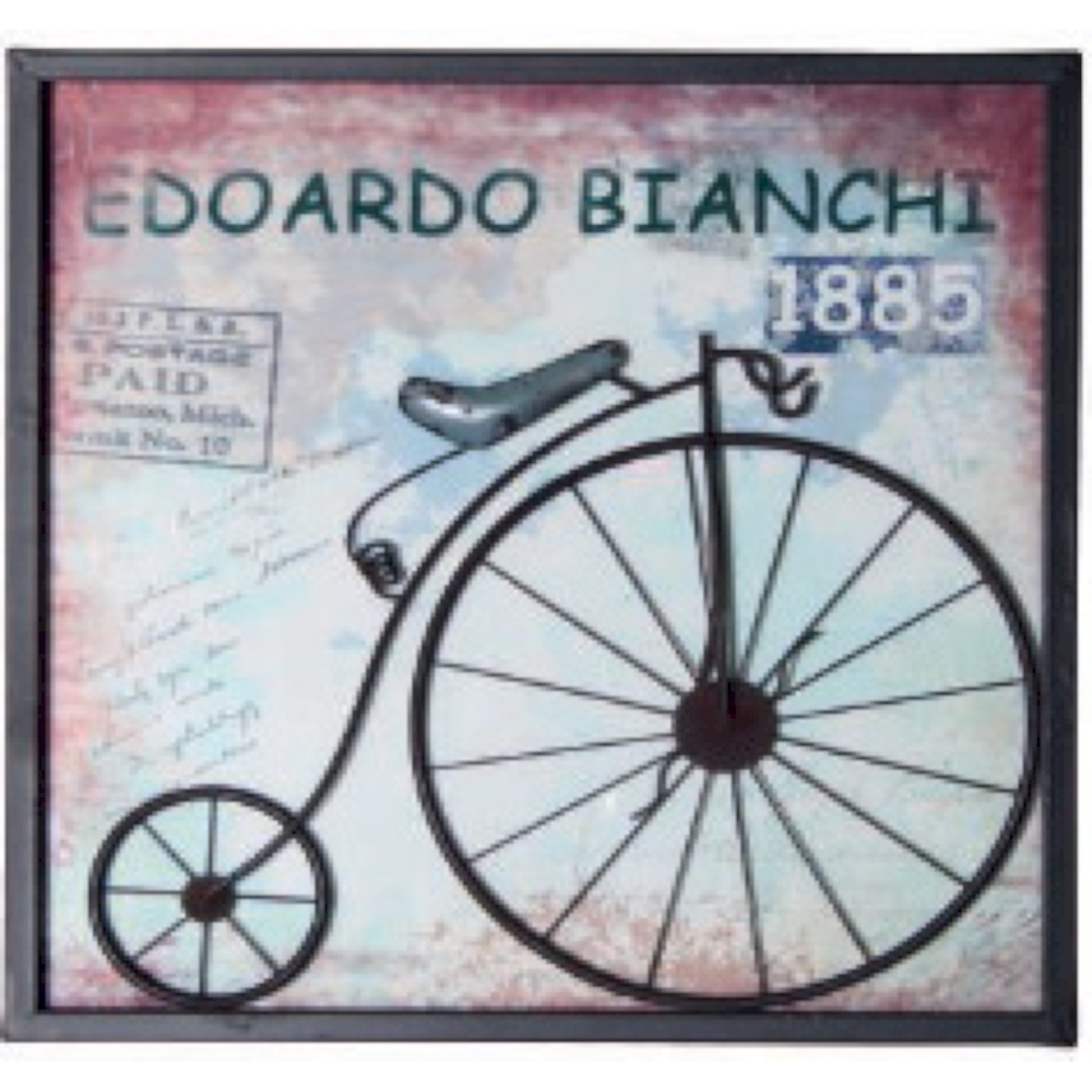 Das Wandbild "Hochrad Bianchi" ist eine charmante und nostalgische Wanddekoration, die die Ästhetik eines klassischen Hochrads in den Mittelpunkt stellt. Hergestellt aus farbig lackiertem Stahl, verleiht es Ihrem Raum eine vintage Note und erzeugt eine zeitlose Atmosphäre. Dieses Bild fängt die Eleganz und das historische Flair dieser einzigartigen Fahrradart ein.