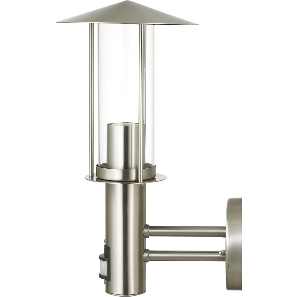 Die silberne Wandleuchte aus Edelstahl mit Glas und integriertem Bewegungsmelder ist eine hochfunktionale Beleuchtungslösung für den Außenbereich. Ihr robustes Edelstahlgehäuse und das klare Glas sorgen für eine langlebige Konstruktion und eine gleichmäßige Lichtverteilung.