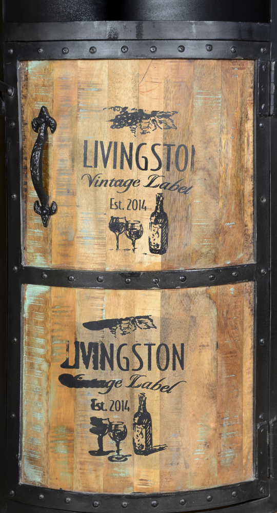 Der Artikel ist aus schwarzem Stahl (pulverbeschichtet) hergestellt und die Türen (mit Aufdruck: LIVINGSTON – Vintage Label) sowie die Top & Bodenplatte sind aus massivem recyceltem Mangoholz.