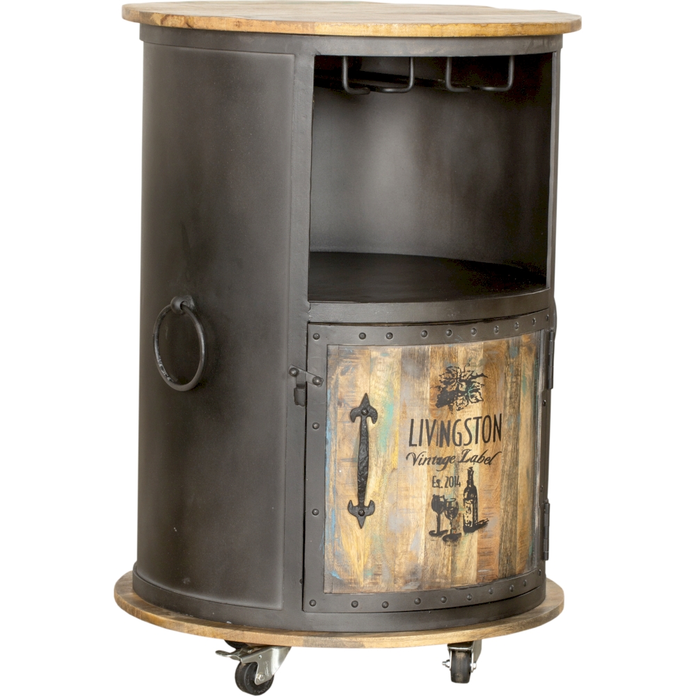 Der Artikel ist aus schwarzem Stahl (pulverbeschichtet) hergestellt und die Türen (mit Aufdruck: LIVINGSTON – Vintage Label) sowie die Top & Bodenplatte sind aus massivem recyceltem Mangoholz.